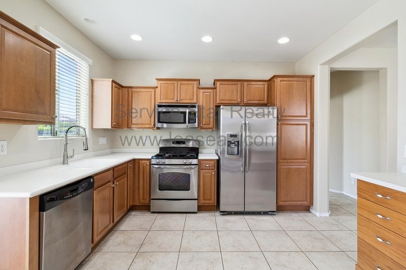 The home features a well-designed layout with a central living space, a spacious kitchen and dining area, and a lovely master suite offering views of the beautifully landscaped desert yard. Recently painted and upgraded with wood-style flooring, this home is move-in ready. The master suite includes a large walk-in closet, a bathroom vanity with ample counter space, and a walk-in shower with a bench. The kitchen is equipped with wooden cabinetry, a bar counter, high-end stainless steel appliances, and a gas stove. There's plenty of storage throughout the home, including additional cabinetry in the laundry room and garage.