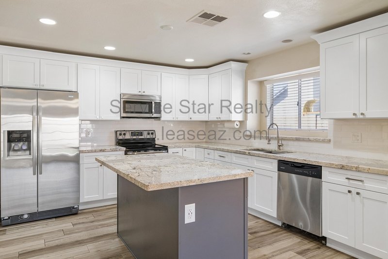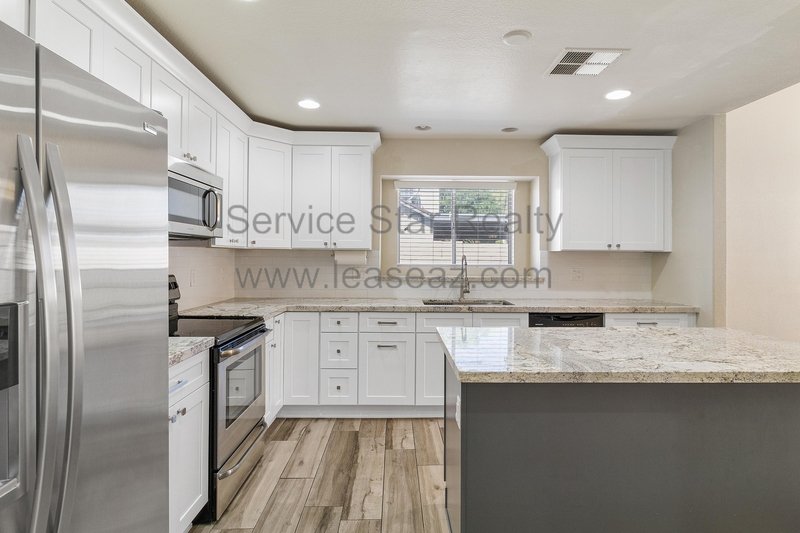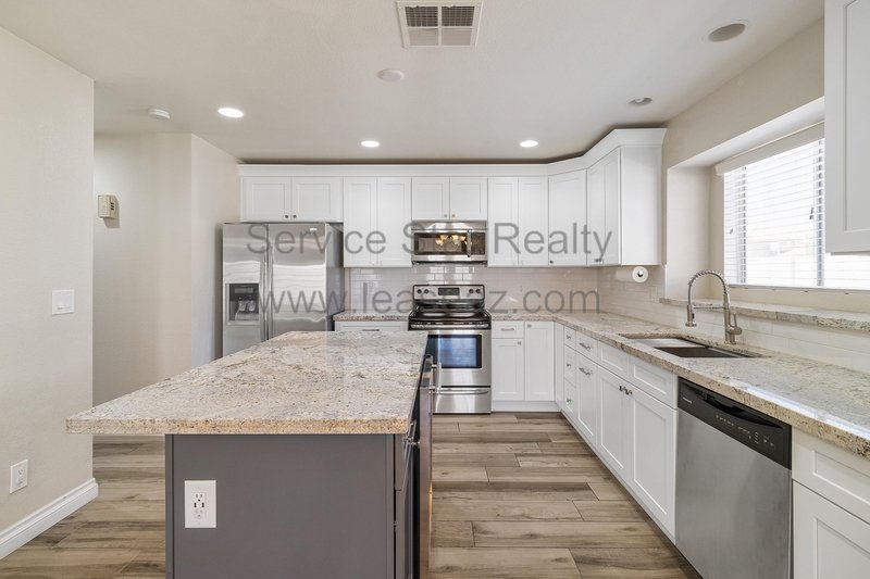 Kitchen features upgraded stainless steel appliances, beautiful stone counters, white cabinetry, and a floating island that ties the space together.