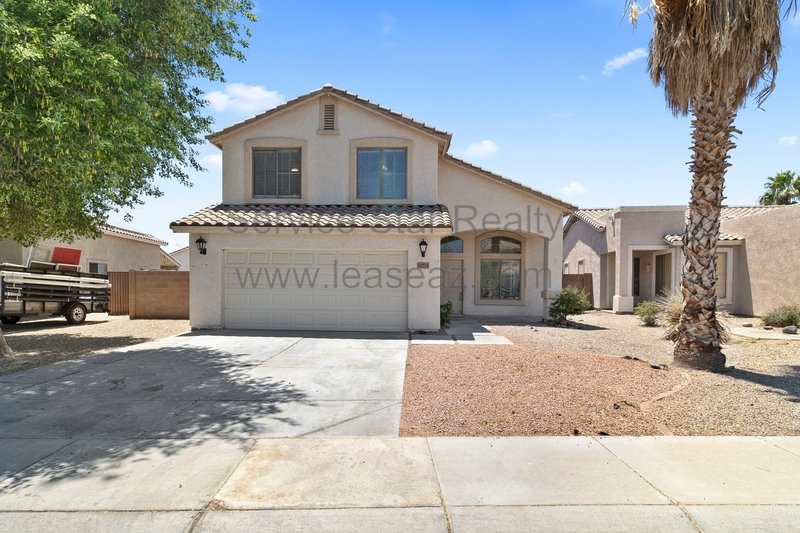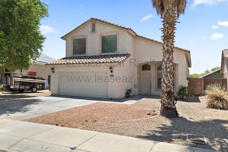 This stunning Avondale home boasts 3 bedrooms, 3 bathrooms, and a den, offering a plethora of features. Highlights include a spacious floorplan with high vaulted ceilings, a bright and open kitchen with a kitchen island, sleek granite countertops, pantry, and stainless-steel appliances. The primary suite includes a walk-in closet with built-in shelving, a large en-suite bathroom with dual sinks, a separate tub and shower, as well as a separate toilet room. Additionally, the two other bedrooms upstairs also feature walk-in closets. Conveniently situated near freeways, shopping centers, restaurants, golf courses, and large community park. Small pets only, under 25 lbs. Tenant to pay monthly solar panel of $160.00. $500.00 off move in charges!!