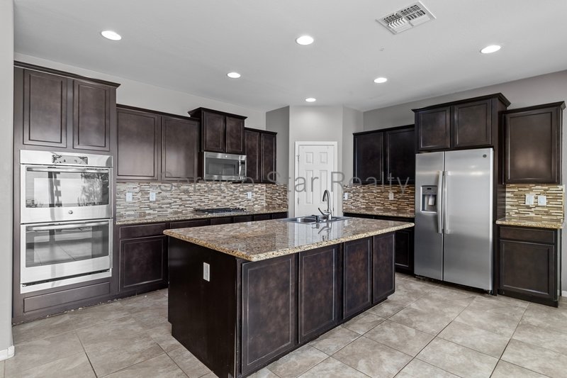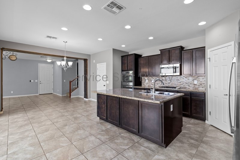 Step inside to an open-concept great room floor plan with elegant tile flooring throughout the main level perfect for easy maintenance. The chefs kitchen is sure to impress, featuring espresso cabinetry with crown molding, granite countertops, a stylish glass tile backsplash, gas cooktop, stainless steel appliances, double ovens, walk-in pantry, and a large center island with breakfast bar seating.