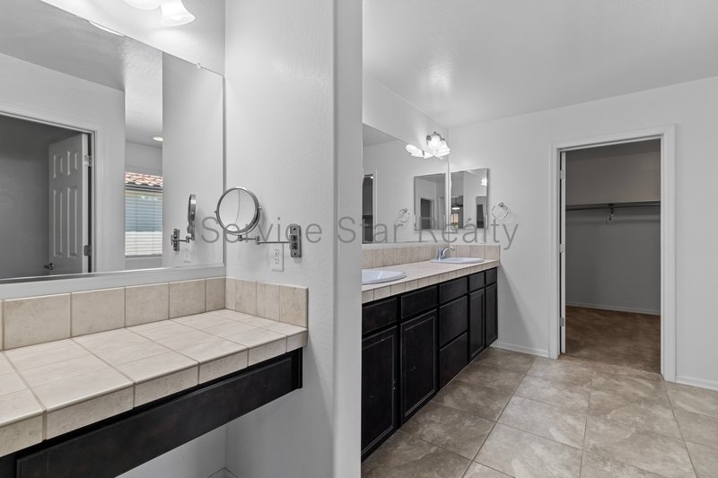Upstairs, you'll find all three bedrooms and a convenient laundry room with full-size washer and dryer included. The oversized primary suite includes a spacious sitting area and luxurious en-suite bathroom with dual sink vanity, makeup counter, soaking tub, separate shower, and walk-in closet. Secondary bedrooms are generously sized and share a well-appointed bathroom with a dual sink vanity.