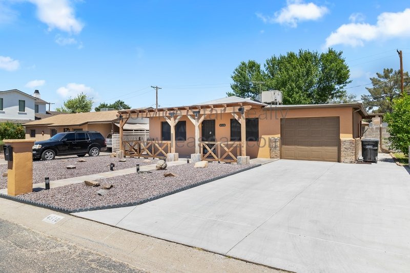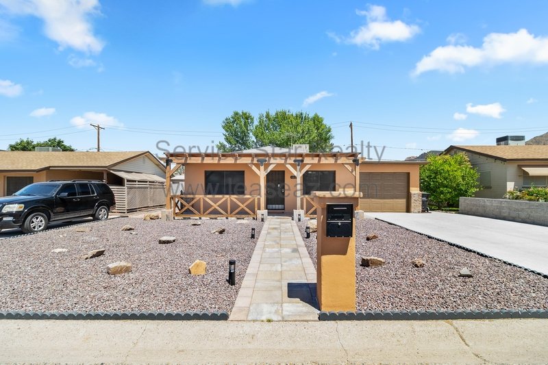 Front yard is beautifully updated, with covered entry, desert landscape, and stone accents.
