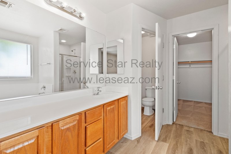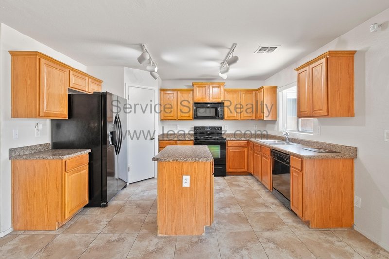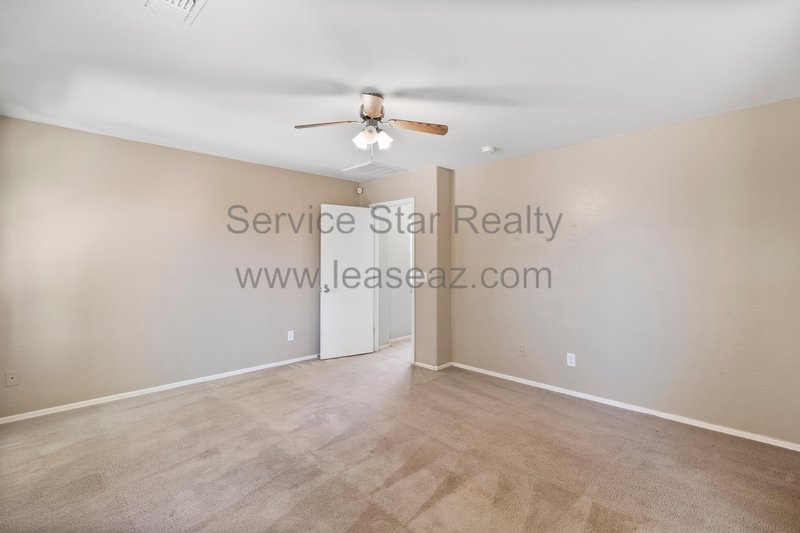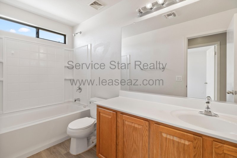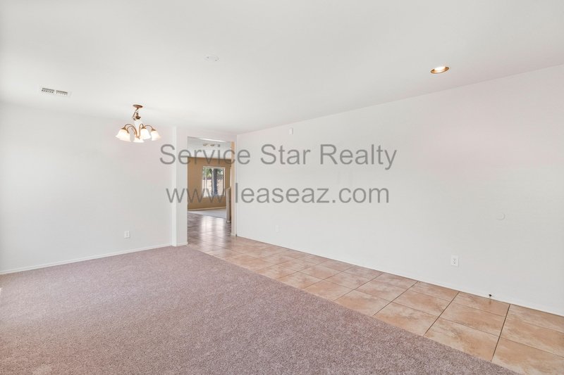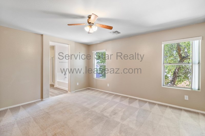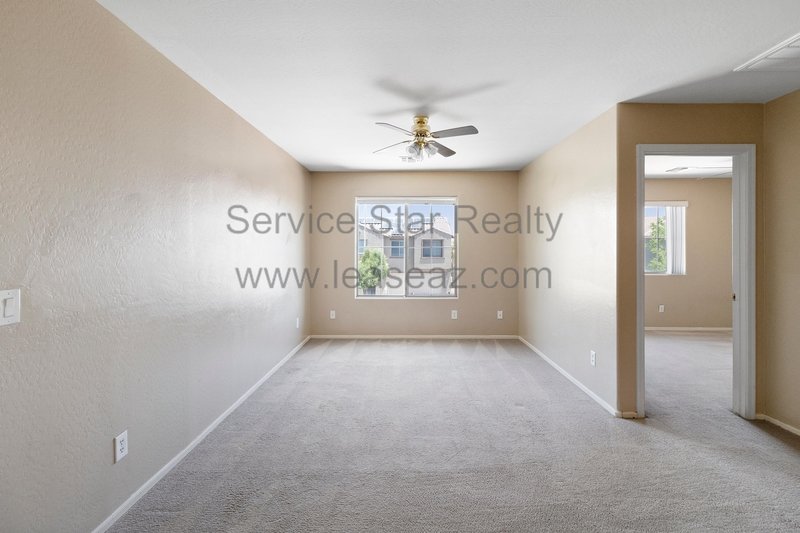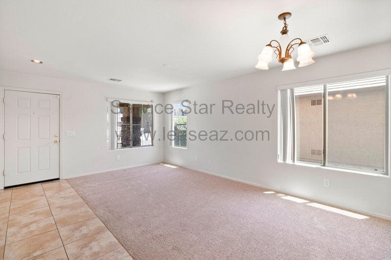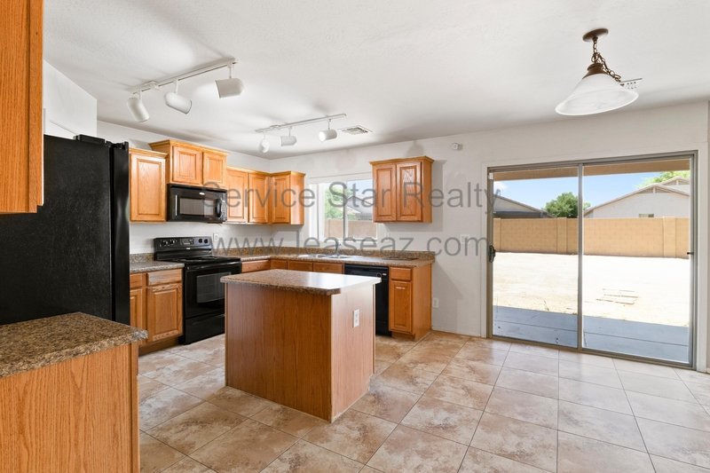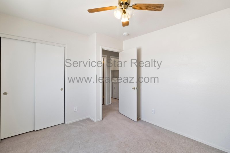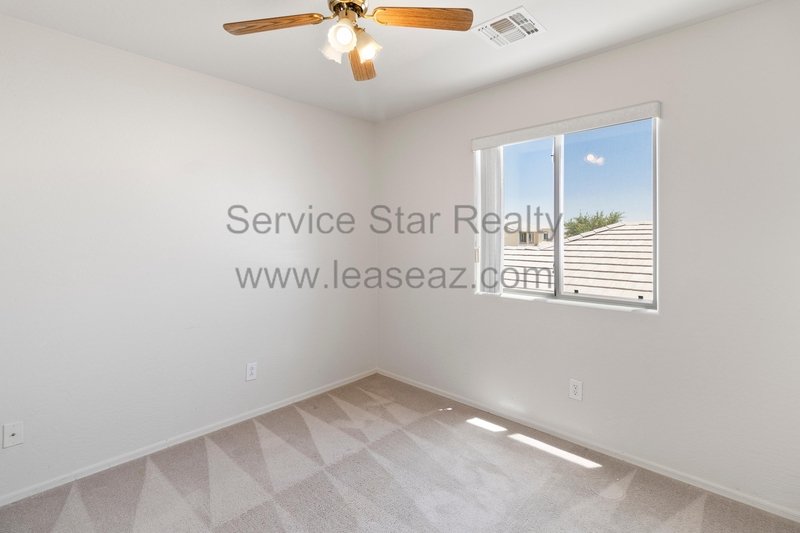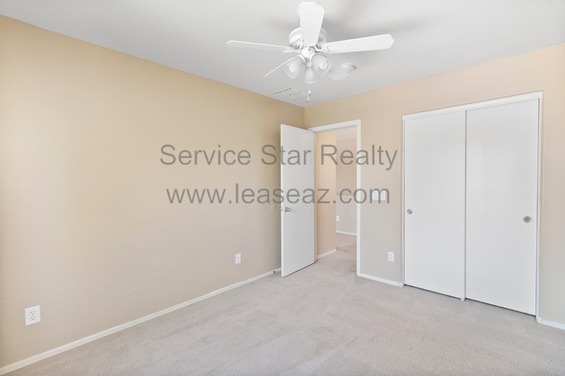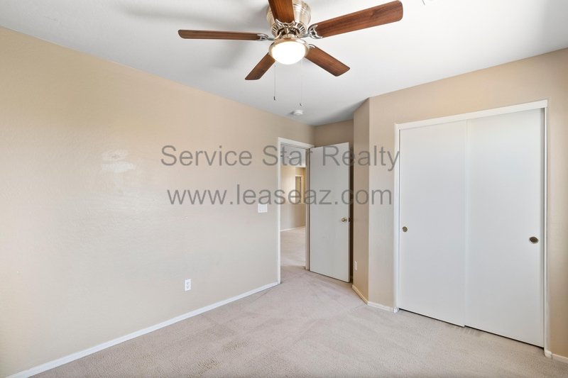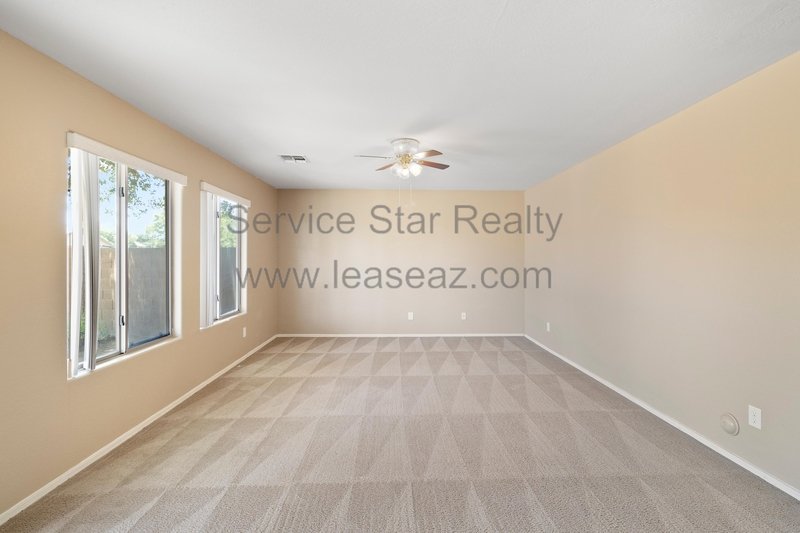 Open living space and formal dining area greets you as you enter through the custom screen doors off the adorable front patio perfect for enjoying morning coffee or watching our beautiful Arizona sunsets. Great kitchen layout features lots of cabinet space, a center island, pantry for extra storage, and comes with full appliance package included. Kitchen faces the family room perfect for entertaining with sliding door out to the covered patio. Master bedroom has private bath with dual sink vanity, garden tub, and separate shower as well as walk in closet. Bedrooms feature cozy carpet, ceiling fans in each, and share a hall bath.
