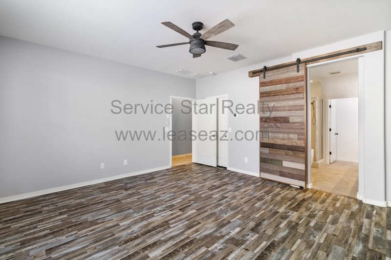 The large master suite is down the hall, and features super tall barn-style door, wood-style flooring, and a gorgeous bathroom with dual-vanity oversized counter, large soaking tub, walk-in shower, private commode room, and walk-in closet! This master suite is a true retreat.