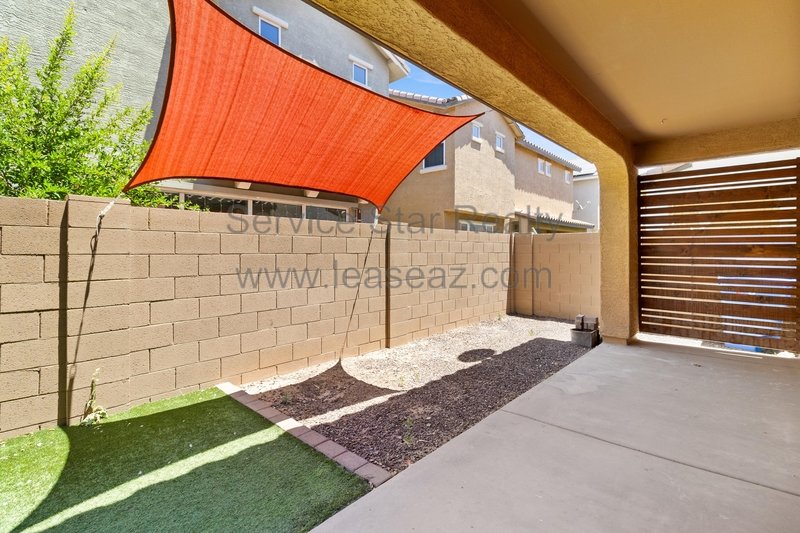 The rear yard features a covered patio, turf patch, and awning for added shade/privacy.