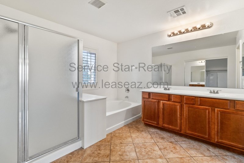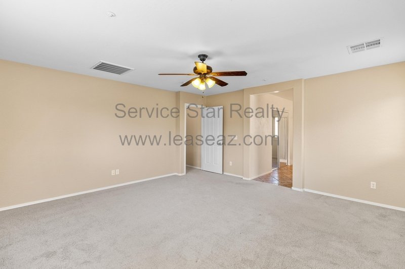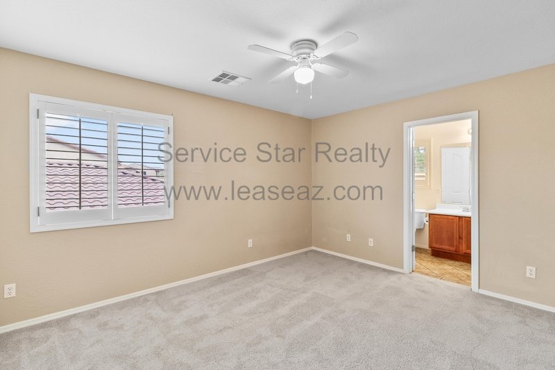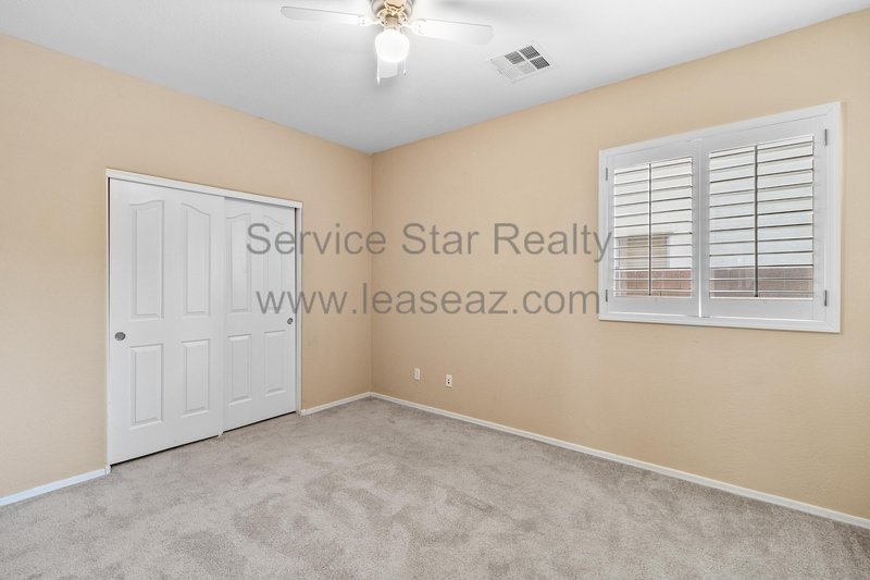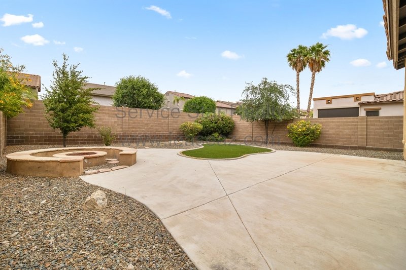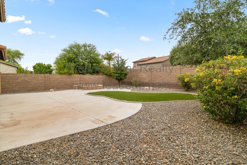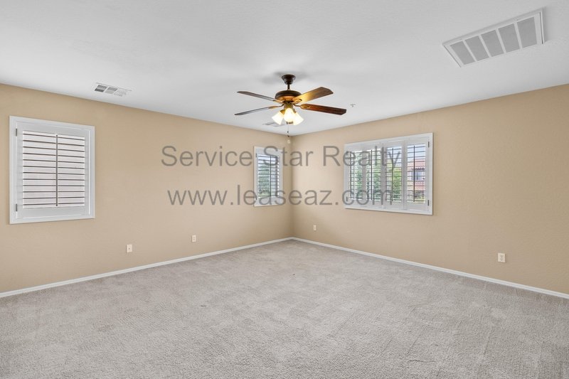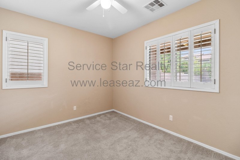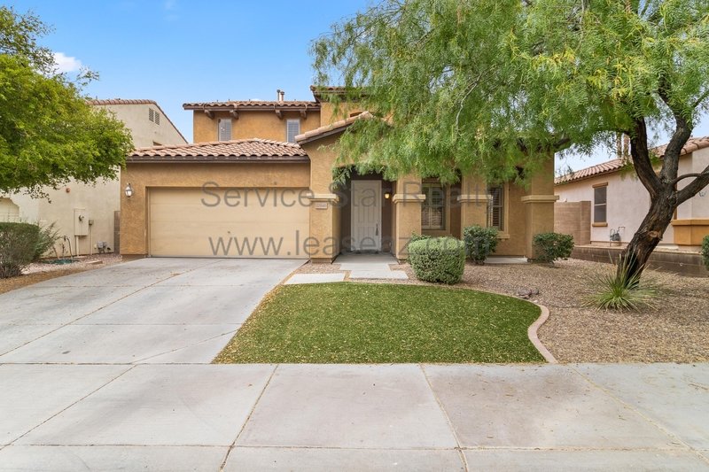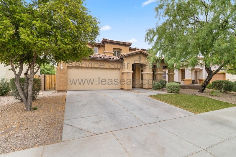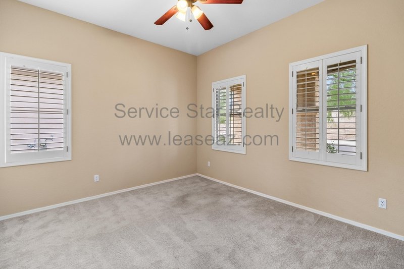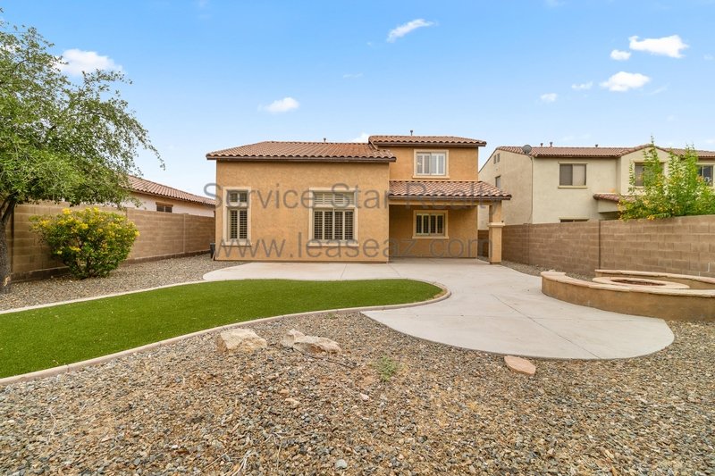 Fantastic 5 bedroom, 3 bathroom home in Vistancia Village with over 2600 square feet of living space is available now! This large backyard is perfect for entertaining, while also being very low maintenance! Enjoy a covered patio, custom stone firepit with bench seating, extended paved area and artificial turf! This home offers a huge kitchen equipped with all appliances, an oversized kitchen island, walk in pantry and extended cabinets into the dining area for extra storage. Plantation shutters throughout offer a gorgeous modern look and allow tons of natural light when you want it. There are 2 bedroom and a den located on the first floor, with remaining 3 bedrooms upstairs. The large master bedroom is located on the second floor and includes a private bath with double sinks, garden tub and separate walk in shower. The Community of Vistancia offers residents a Clubhouse, Community Pool, Greenbelts and a Workout Facility.