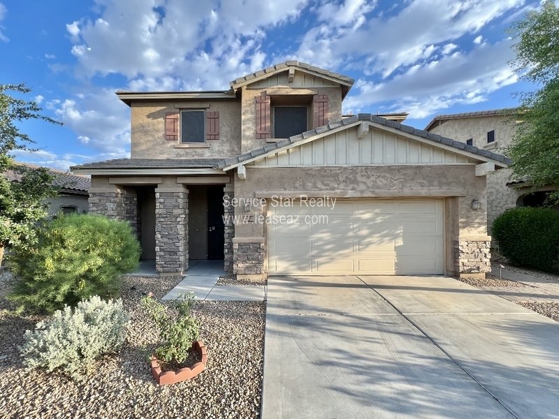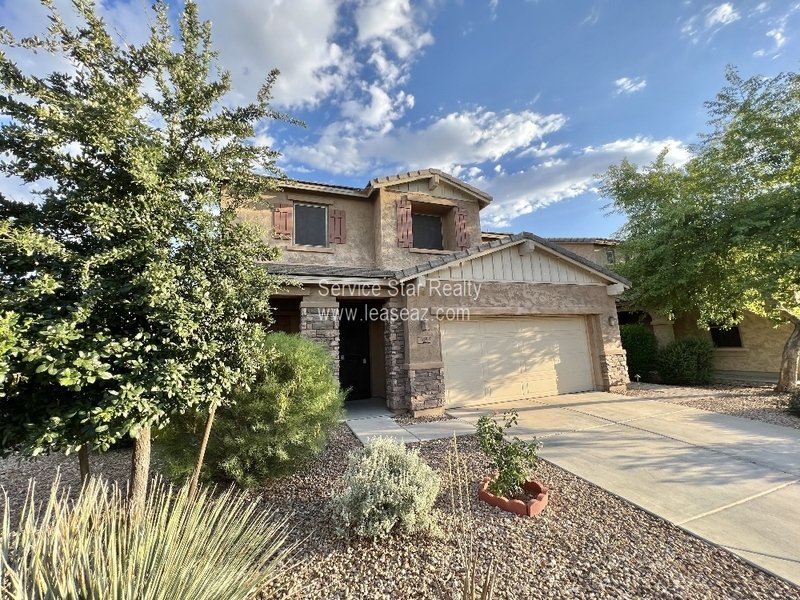 Kitchen offers tons of cabinet and counter space, breakfast bar, granite counters and oak cabinets and a walk-in pantry. 1 bedroom and 1 bathroom downstairs off the living area. Large under stair storage area and linin closet for lots of storage. 3 bedrooms + oversized loft upstairs. Large master bedroom with en-suite bath offering a soaking tub, walk-in shower, dual sinks and large walk in closet. The other 2 bedrooms are on the opposite side and share the hall bathroom with dual sinks and shower/tub combo. There is also a linen closet off the hall bath for additional storage. Backyard has beautiful pavers for plenty of seating, beautiful artificial turf, fruit trees and a built in bbq. This home also offers a tandem 3 car garage and a full size washer/dryer included in upstairs laundry room! Reverse osmosis system and water softener included but not warrantied. Refrigerator in garage included but not warrantied.