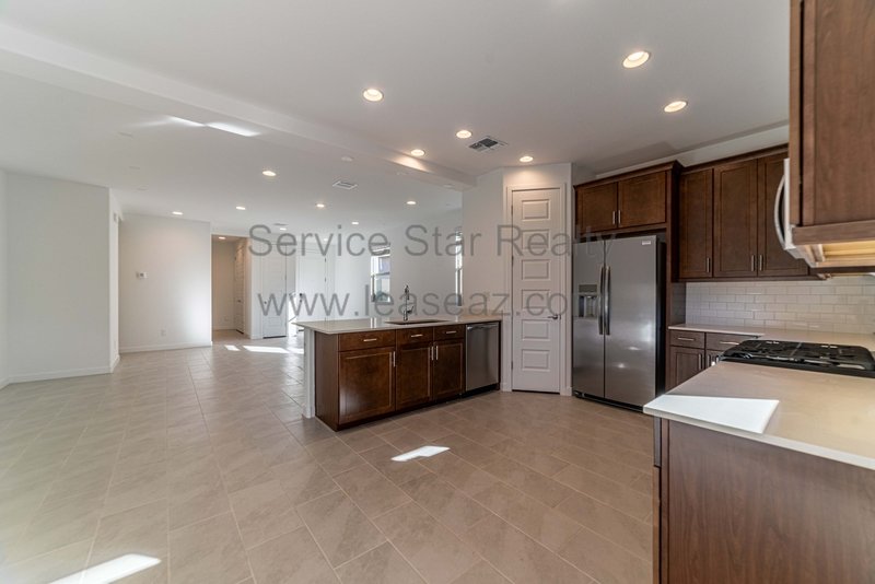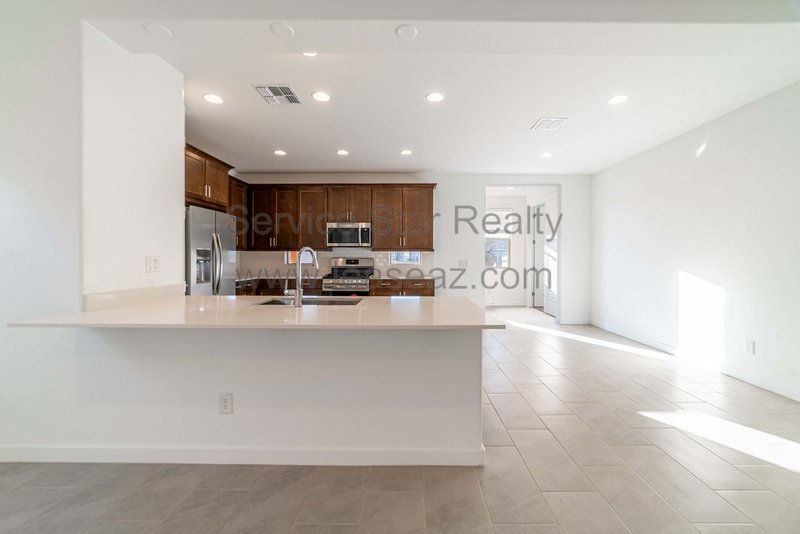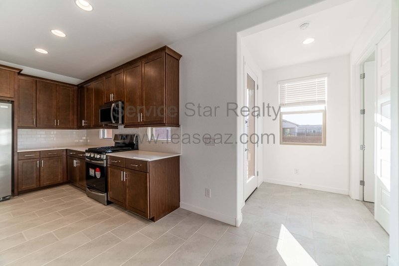 Located in Discovery at Western Enclave, this charming residence places you right in the heart of Glendales entertainment scene, perfect for both daily life and lively gatherings. The spacious open great room seamlessly flows into the kitchen and dining area, showcasing beautiful dark maple cabinetry, stunning white sand quartz countertops, a cozy breakfast bar, and sleek stainless steel appliances, including a gas stove. Youll love the upgraded white sand tile flooring and the plush carpeting in the bedrooms that add a touch of luxury.