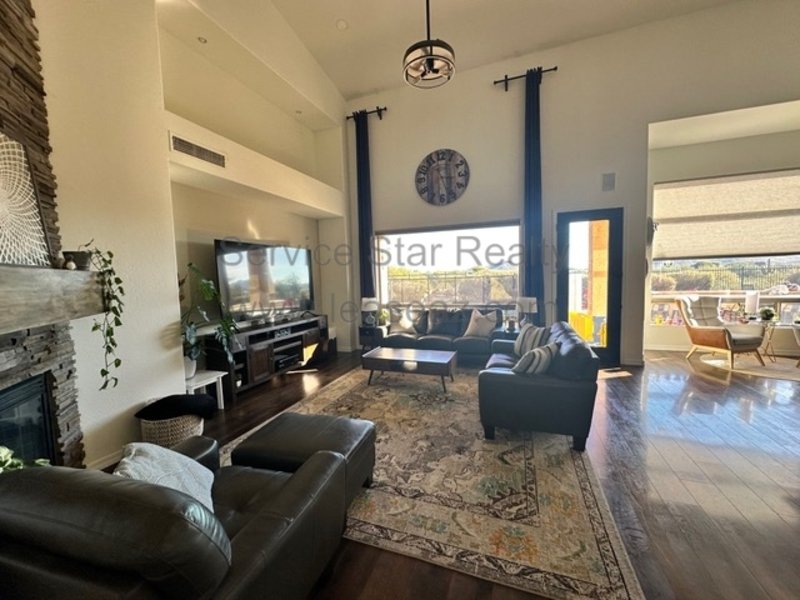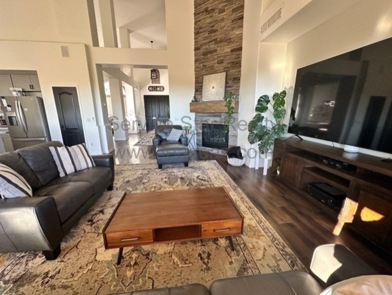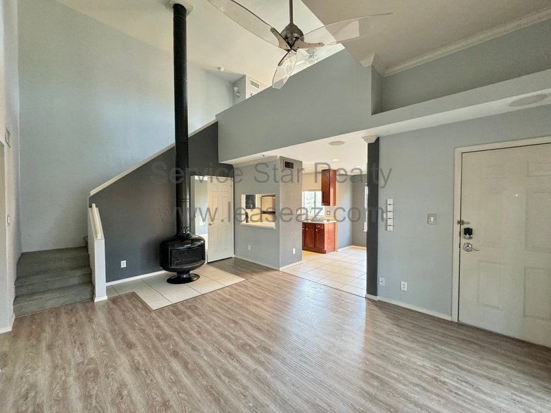 As you step inside, you are greeted with super tall ceilings, wood-style flooring, a modern fireplace, a kitchen that opens up to the main living area, and a separate dining nook.