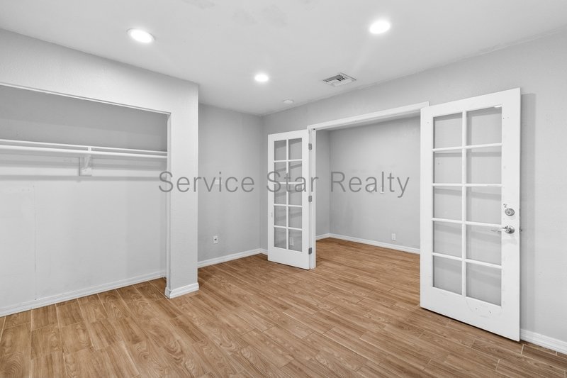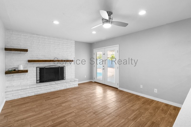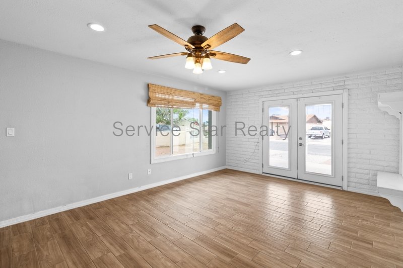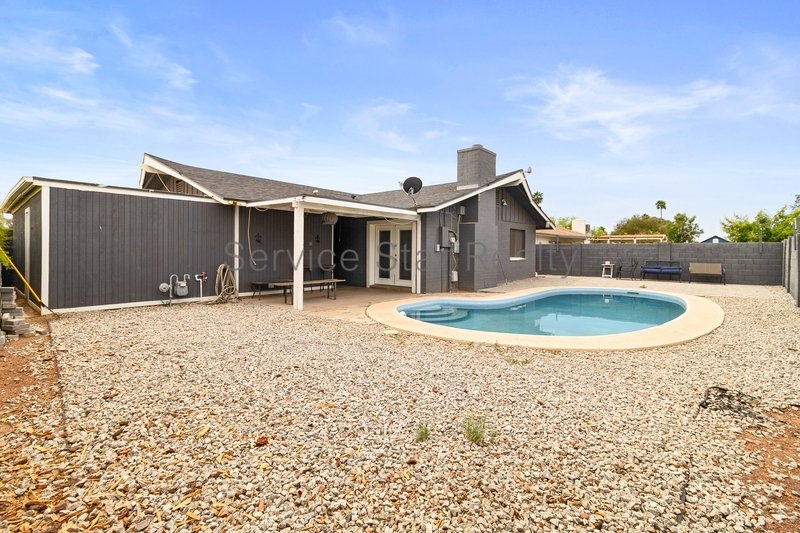 Overlooking the rear yard through French Doors, there is a large covered patio area and pool! Perfect for enjoying the beautiful Arizona weather all year long.