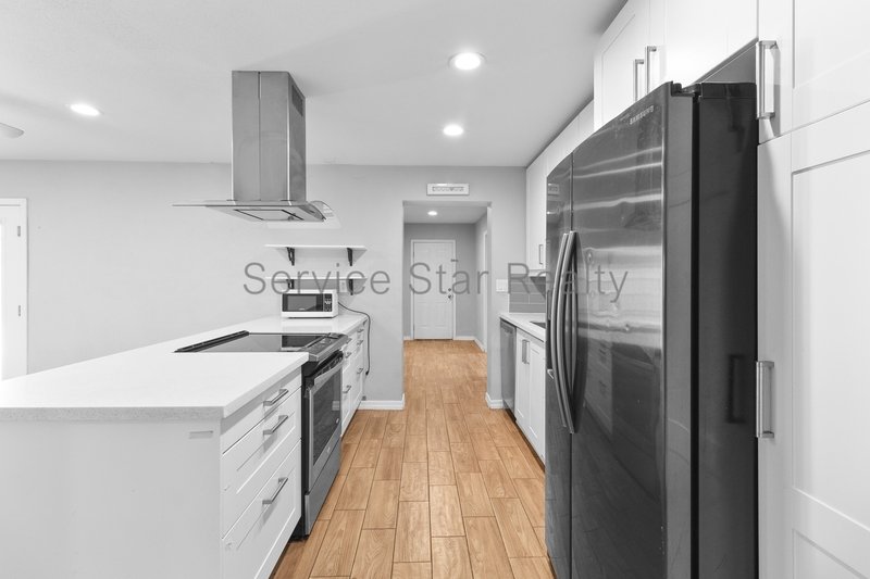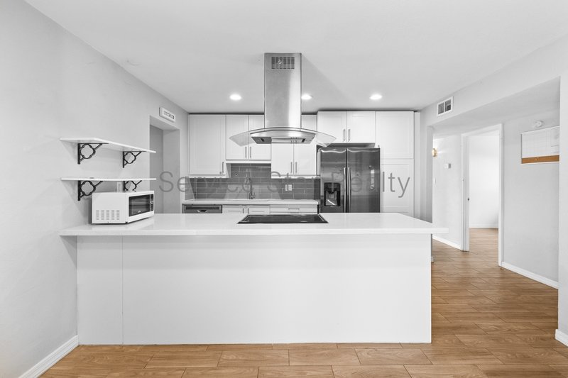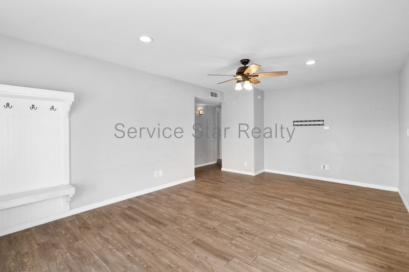 With a light and bright interior, you are welcomed home. Elegant wood-style flooring throughout the home provides an elevated and modern feel, while the living room fireplace adds a sense of charm, alongside the brick accent wall(s).