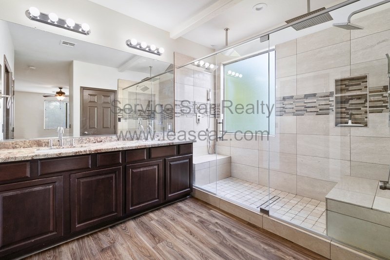 Upstairs, the primary suite is a true retreat. With an oversized bedroom, this room features a large walk-in closet, separate linen closet, massive dual-vanity with upgraded fixtures and stone counters, a luxurious glass walk-in shower with beautiful tiling, and a private commode room.