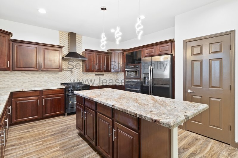 The kitchen features beautiful, upgraded stone countertops and tile backsplash, built-in TV, dark wood cabinetry, gas range with floating water dispenser, and upgraded appliances including stacked oven/microwave.