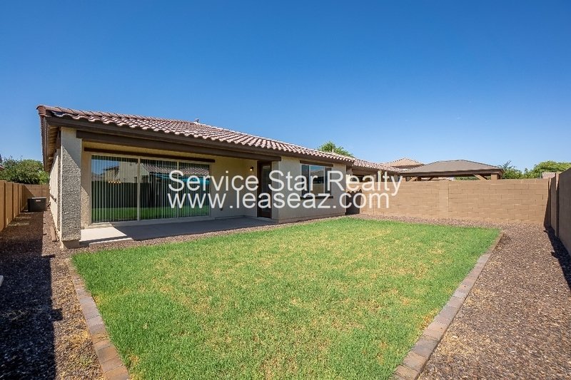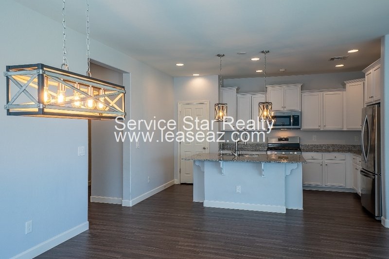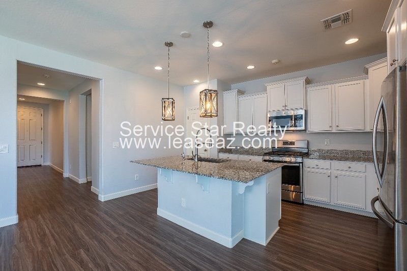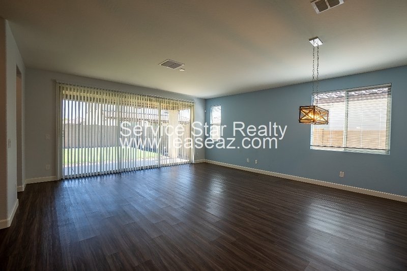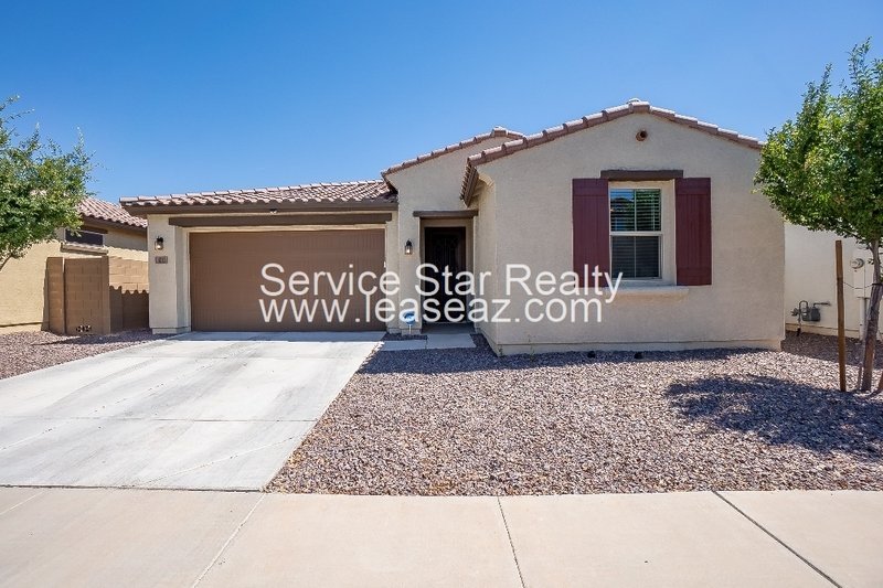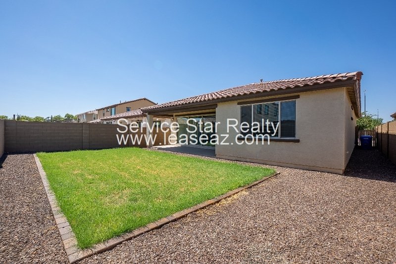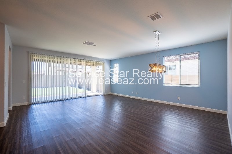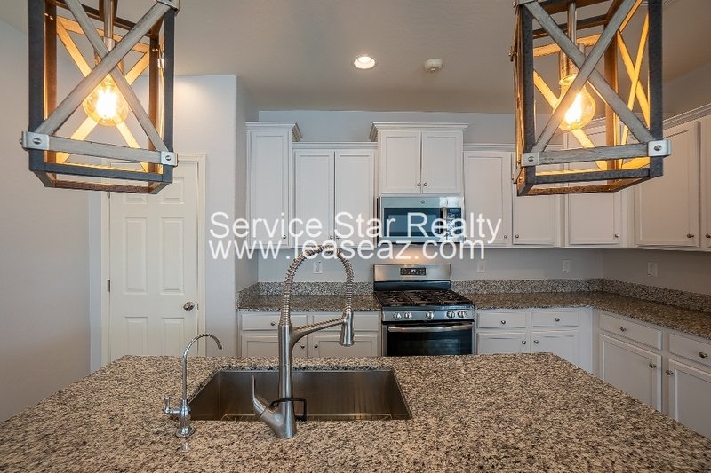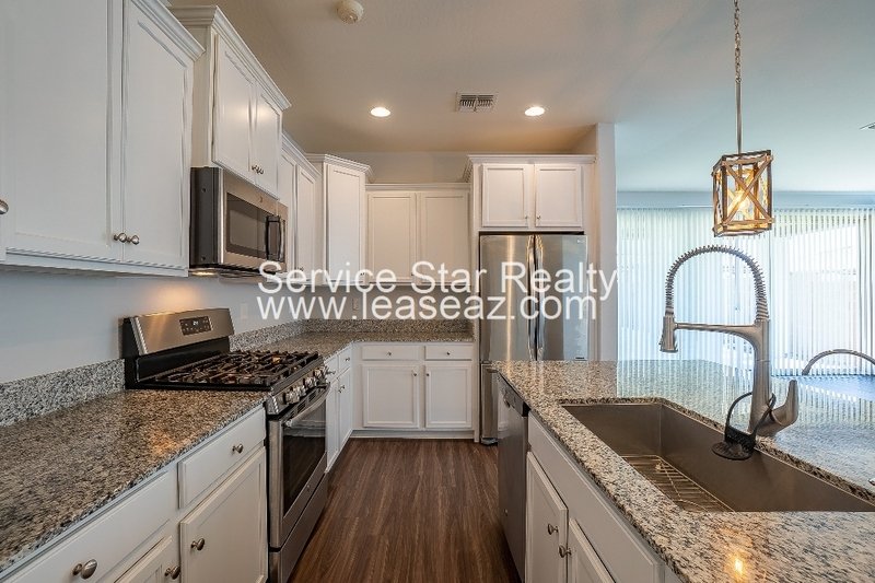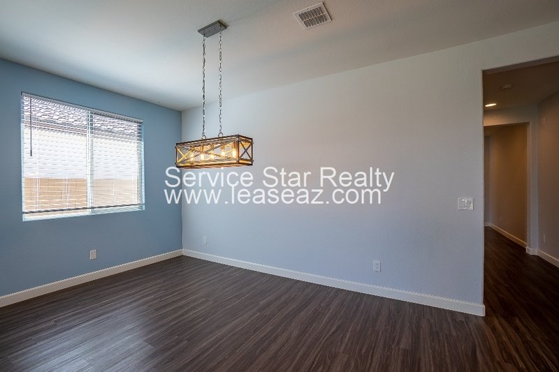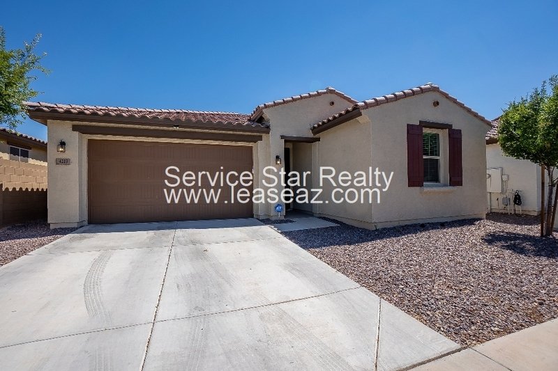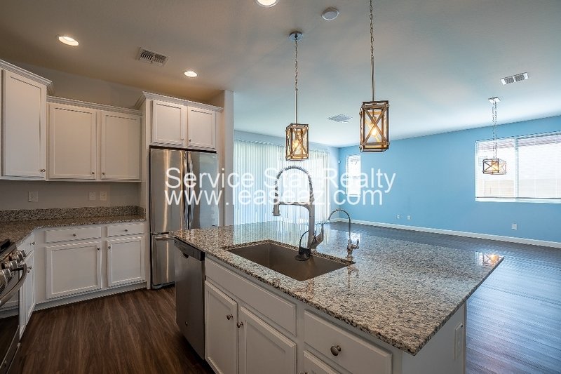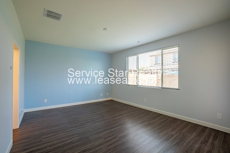 Discover a 4-bedroom, 2-bath home in Mountain Vista! This single-level residence features a 2-car garage and spans 1,800 square feet. Its open floor plan boasts upgraded laminate plank flooring and 2-inch faux wood blinds. The kitchen shines with white cabinets, granite countertops, stainless steel appliances, and pendant lights above the breakfast bar. The spacious master bedroom includes an en-suite bathroom with dual vanities, a walk-in shower, a large walk-in closet, and direct backyard access. The backyard has a large covered patio, a grass area with brick borders, and decorative rock.