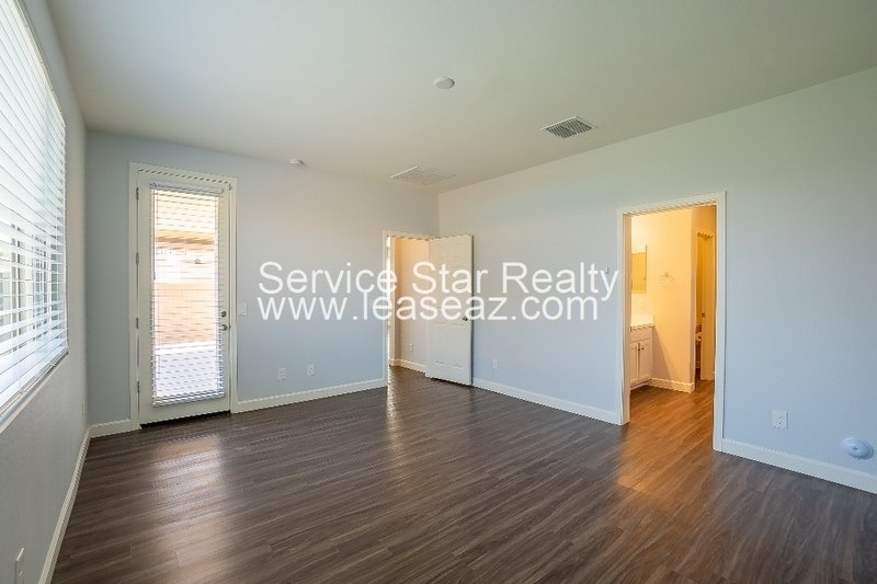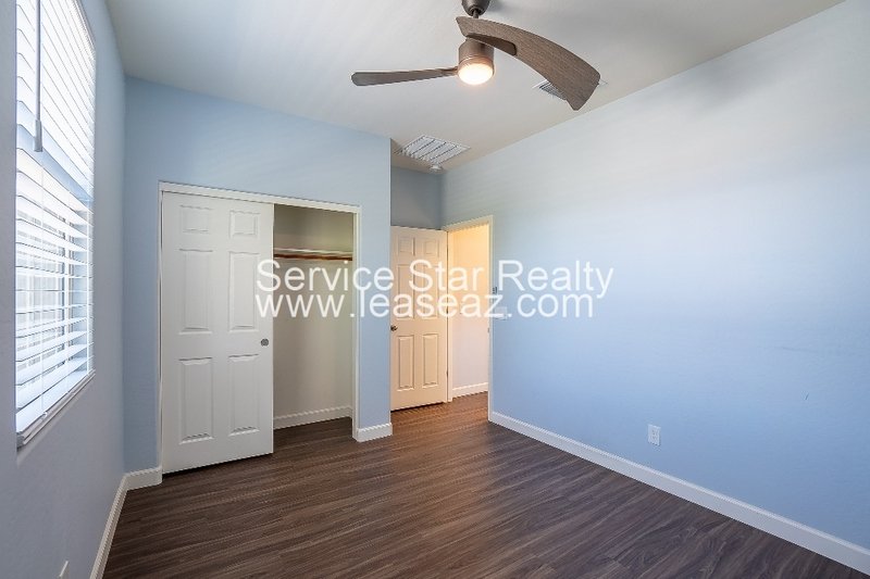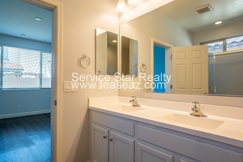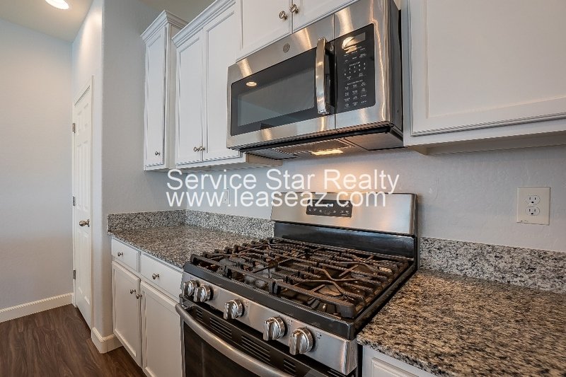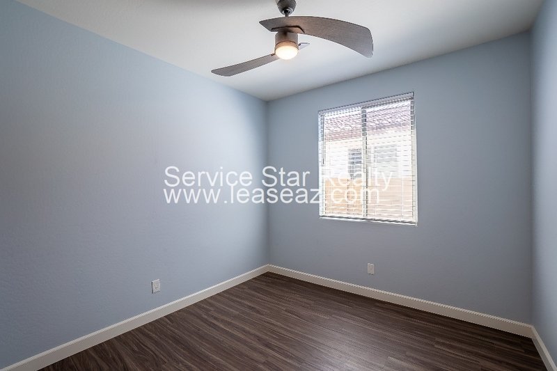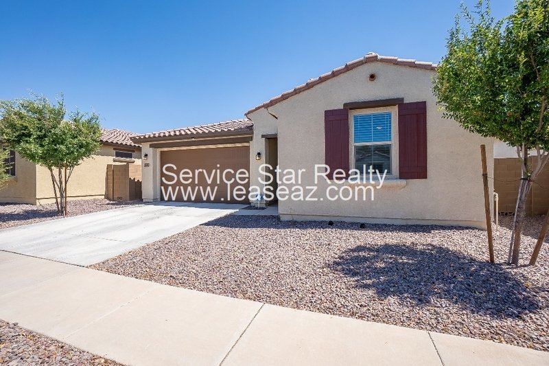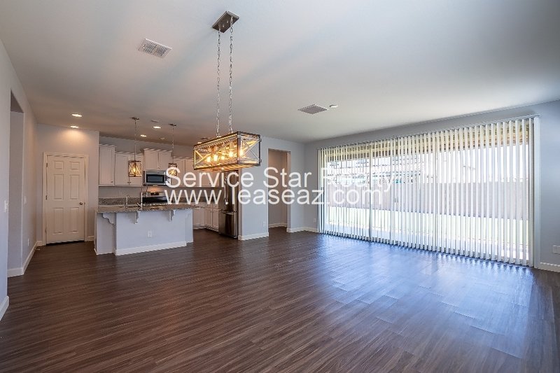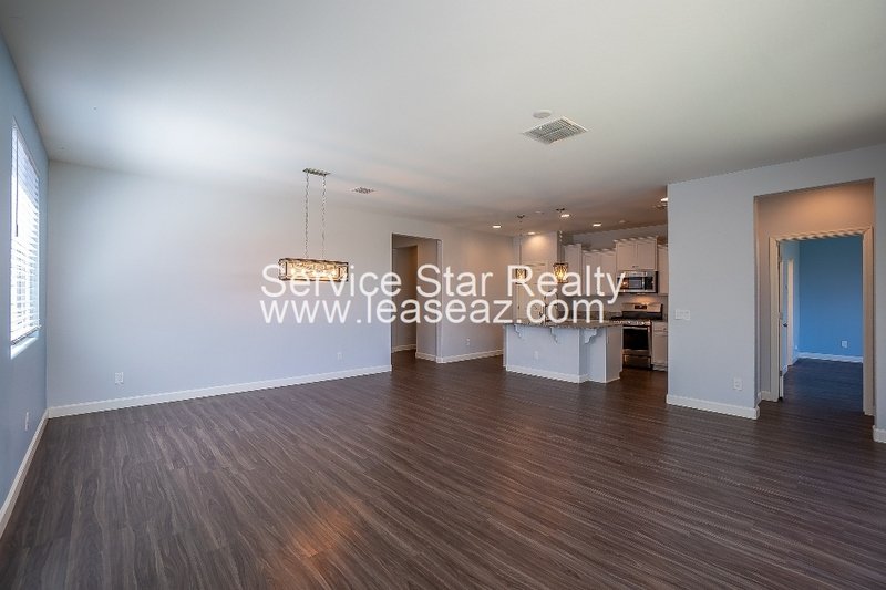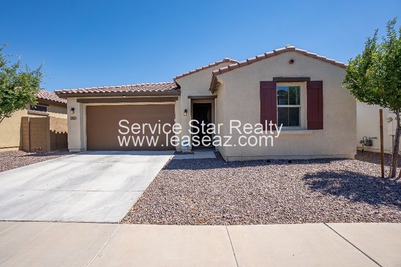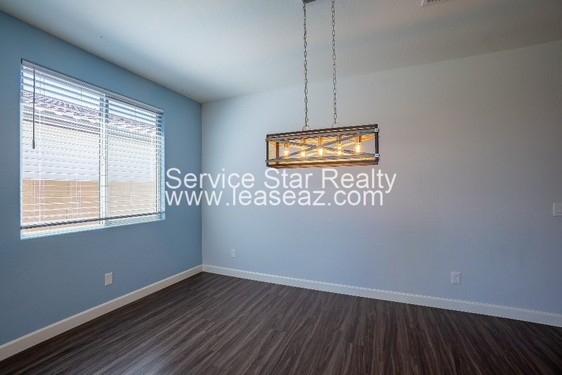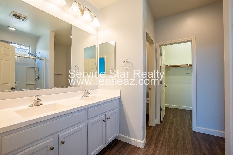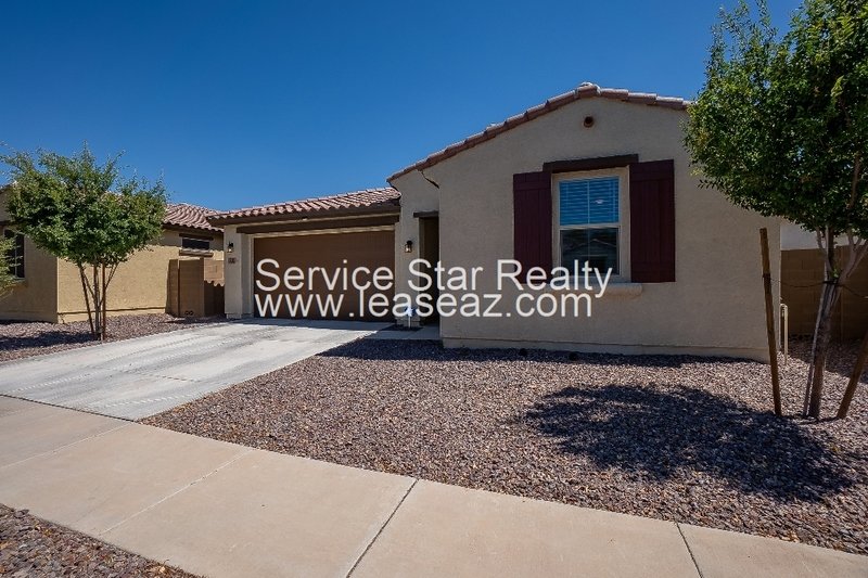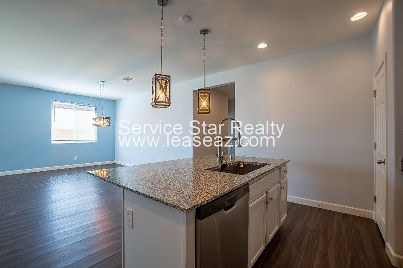 Discover a 4-bedroom, 2-bath home in Mountain Vista! This single-level residence features a 2-car garage and spans 1,800 square feet. Its open floor plan boasts upgraded laminate plank flooring and 2-inch faux wood blinds. The kitchen shines with white cabinets, granite countertops, stainless steel appliances, and pendant lights above the breakfast bar. The spacious master bedroom includes an en-suite bathroom with dual vanities, a walk-in shower, a large walk-in closet, and direct backyard access. The backyard has a large covered patio, a grass area with brick borders, and decorative rock.