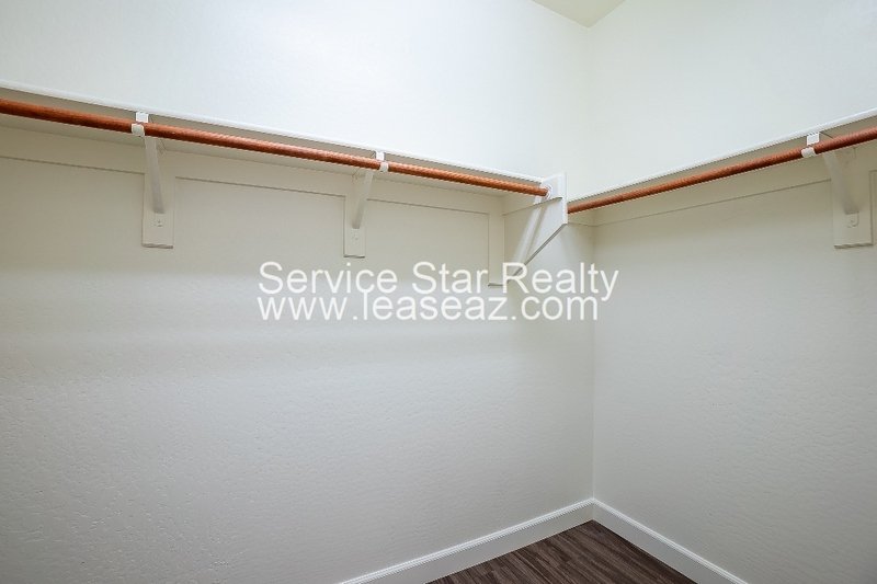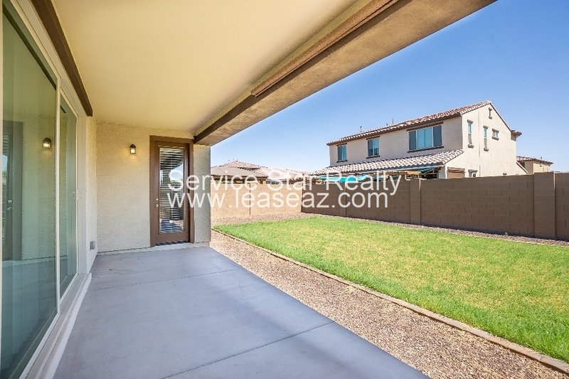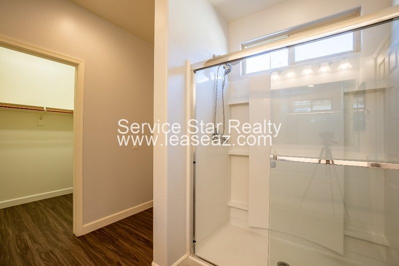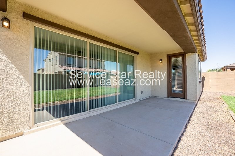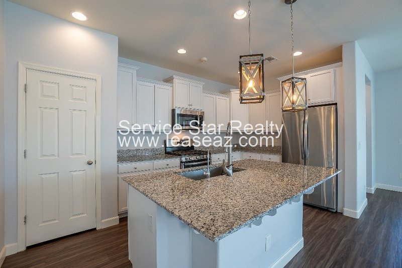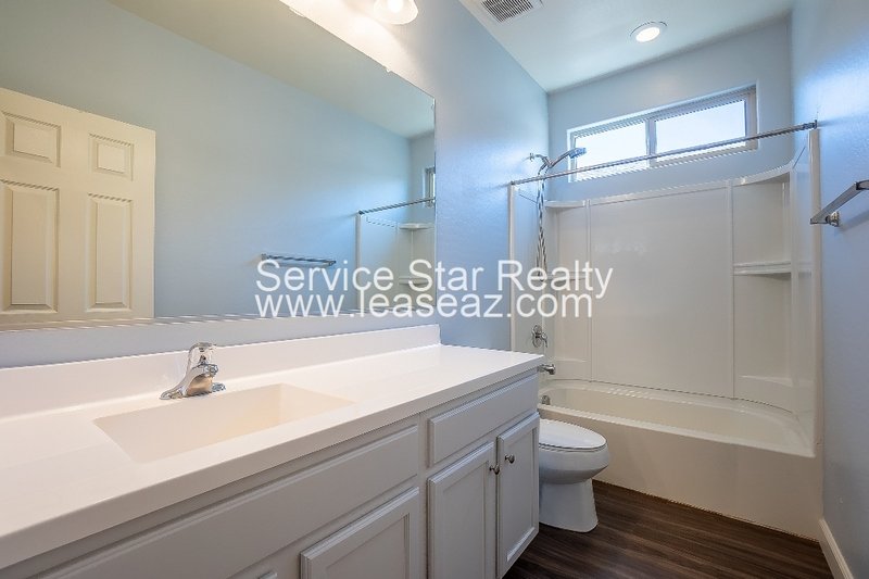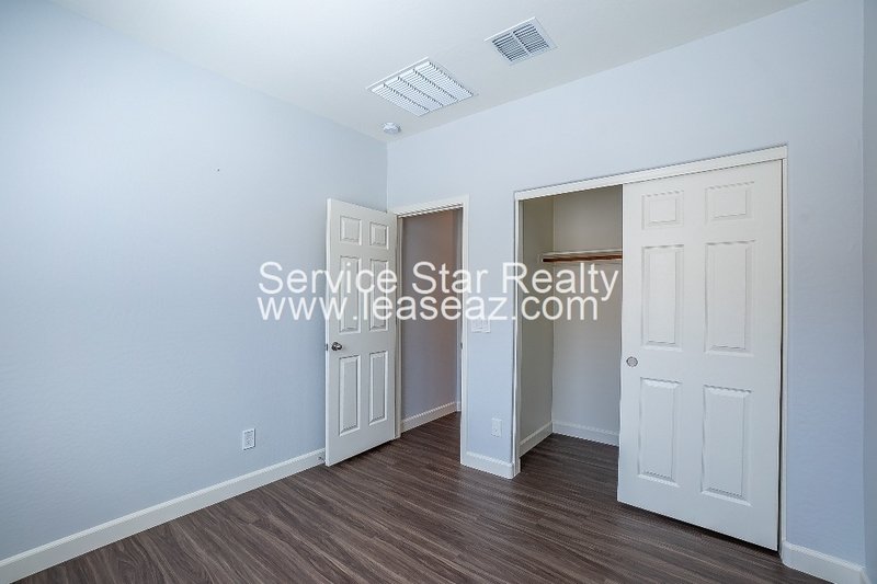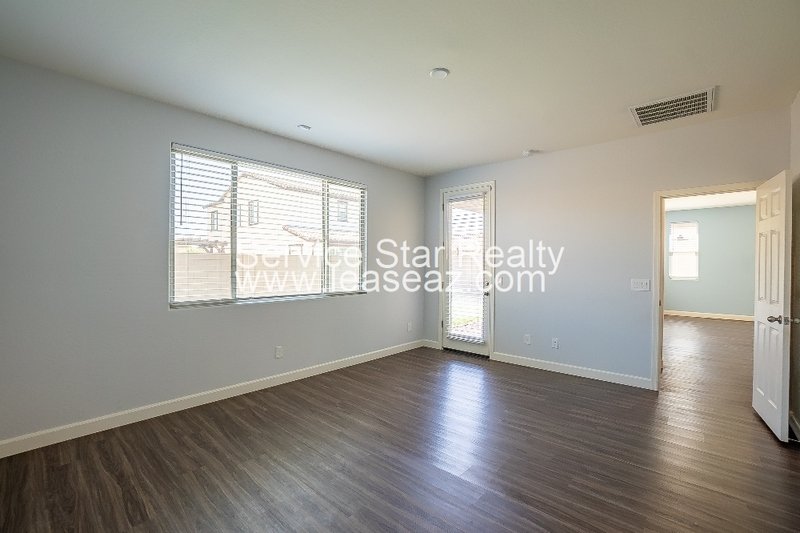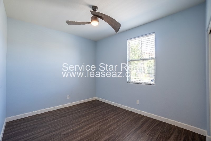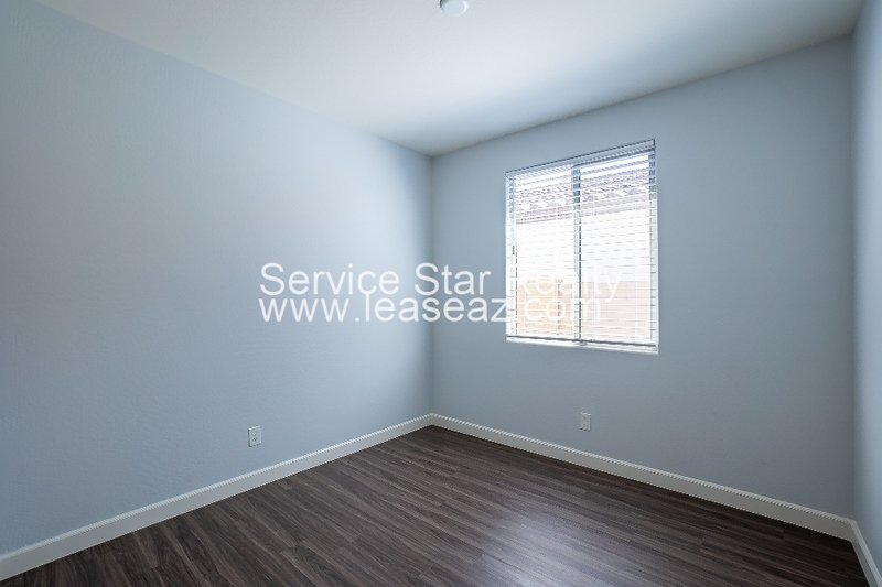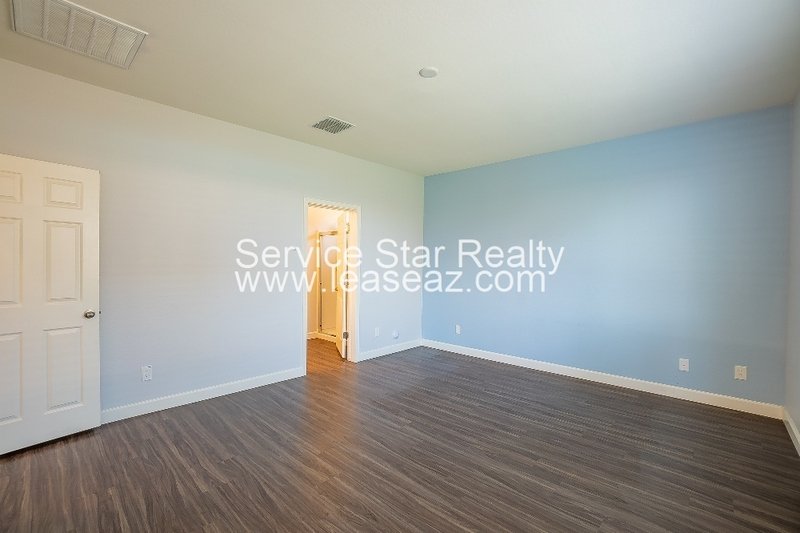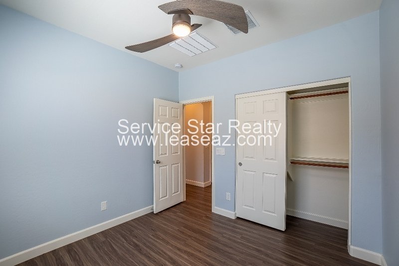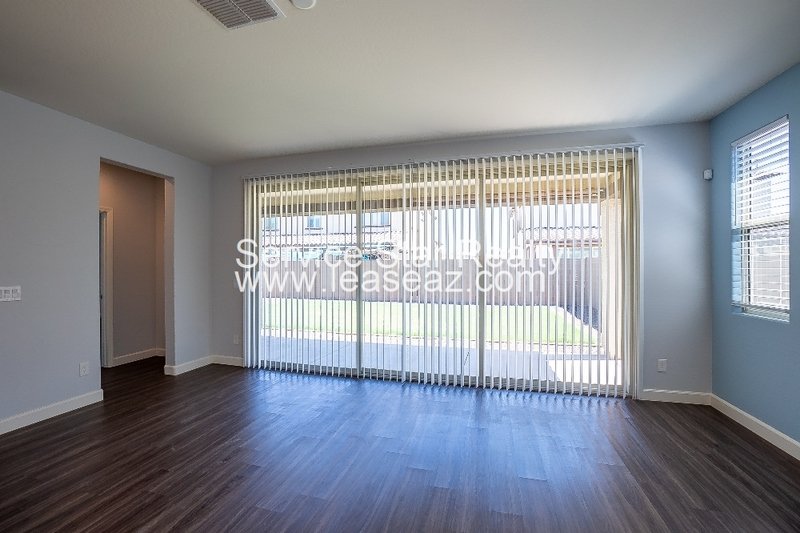 Discover a 4-bedroom, 2-bath home in Mountain Vista! This single-level residence features a 2-car garage and spans 1,800 square feet. Its open floor plan boasts upgraded laminate plank flooring and 2-inch faux wood blinds. The kitchen shines with white cabinets, granite countertops, stainless steel appliances, and pendant lights above the breakfast bar. The spacious master bedroom includes an en-suite bathroom with dual vanities, a walk-in shower, a large walk-in closet, and direct backyard access. The backyard has a large covered patio, a grass area with brick borders, and decorative rock.