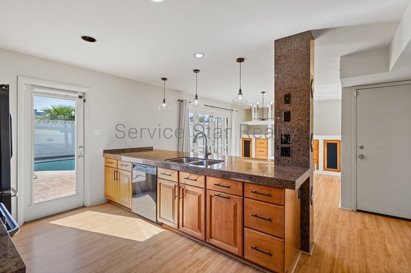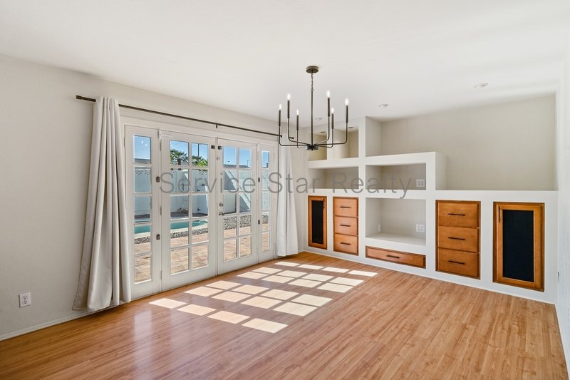 The kitchen features beautiful wood cabinetry, upgrades stone/tile work, and an island / counter setup with pendant lighting and bonus seating! The dining area has lovely built-ins that can be used for storage or display. French doors open-up to the rear yard which allows you to enjoy the beautiful Arizona weather from the comfort of your dining space. This home is perfect for everyday enjoyment or for entertaining.