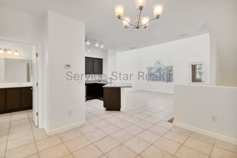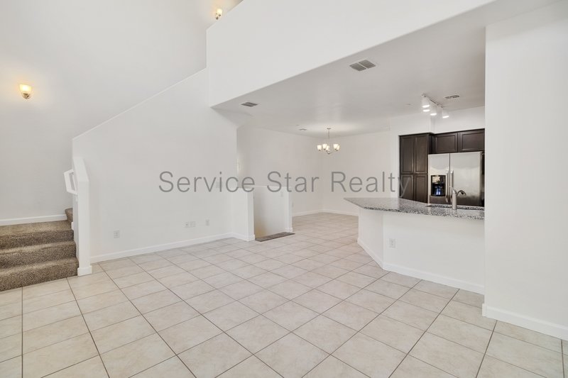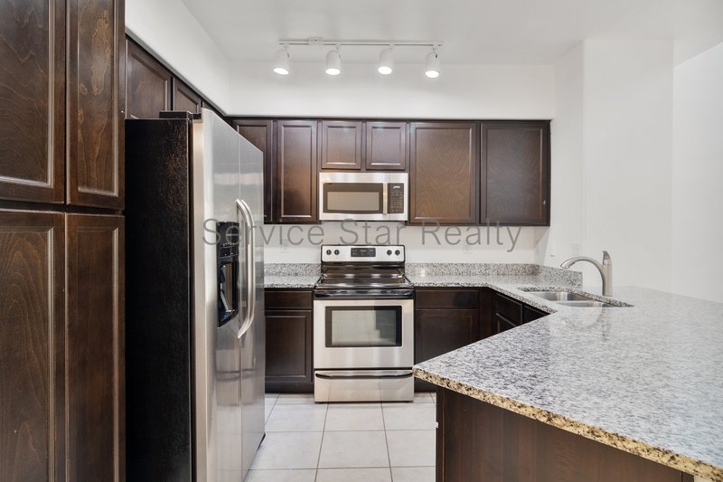 The inviting main living area is highlighted by soaring tall ceilings and expansive windows, filling the space with natural light. The kitchen is a true centerpiece, featuring upgraded stone countertops, stainless steel appliances, rich dark wood cabinetry, and a convenient breakfast bar. This open-concept space seamlessly flows into the formal dining area and connects to the second-floor balcony, creating an ideal setting for both relaxation and entertaining.