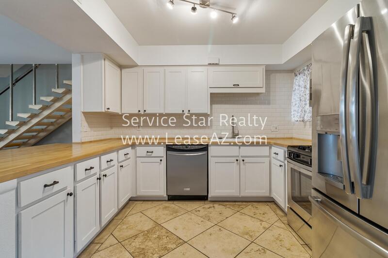 The kitchen features a convenient wrap-around design, and has upgraded backsplash, stainless steel appliances, beautiful wood style counters, and white cabinetry.