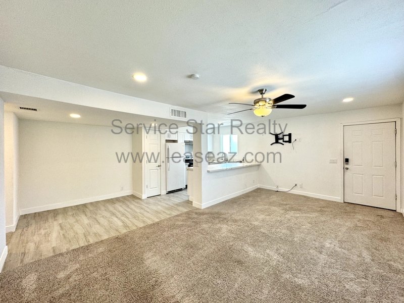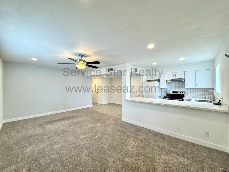 Step inside to discover an updated interior. The neutral color palette throughout creates an inviting atmosphere. The open concept design seamlessly connects the dining nook, living area, and a kitchen island/bar, making it perfect for enjoying quality time or entertaining. The kitchen itself is a gem, with an efficient design and pantry. The home itself offers a comfortable and functional layout, with in-unit laundry and ceiling fans throughout, a great thing for Arizona summers.