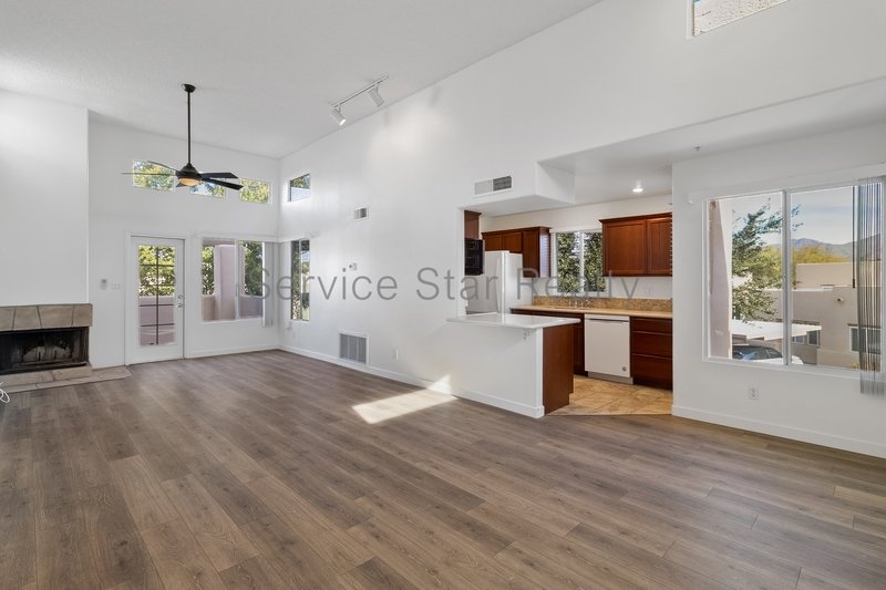 The open-concept living and dining area is bright and airy, with large windows that let in plenty of natural light, and tall ceilings! Cozy up next to the fireplace and take in the attractive woodlike flooring, neutral tones, and modern finishes throughout that create such an inviting atmosphere.