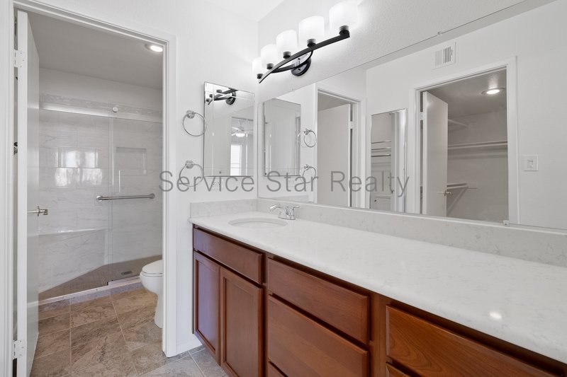 The primary suite is large, and features an en-suite bathroom, a walk-in closet, large vanity area, and glass walk-in shower!