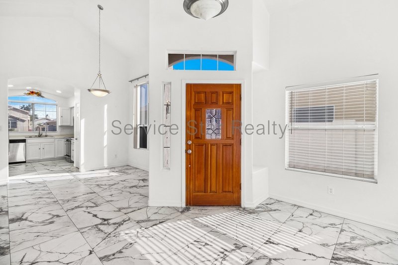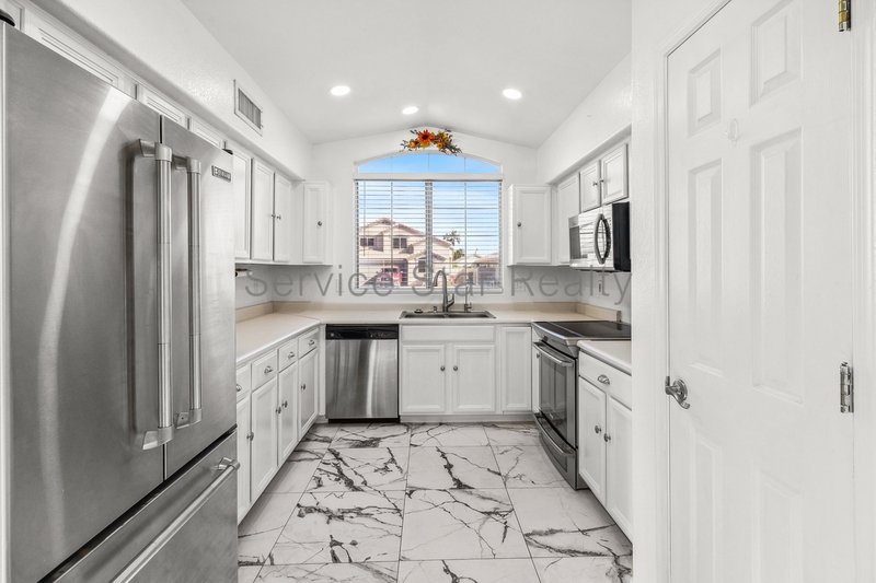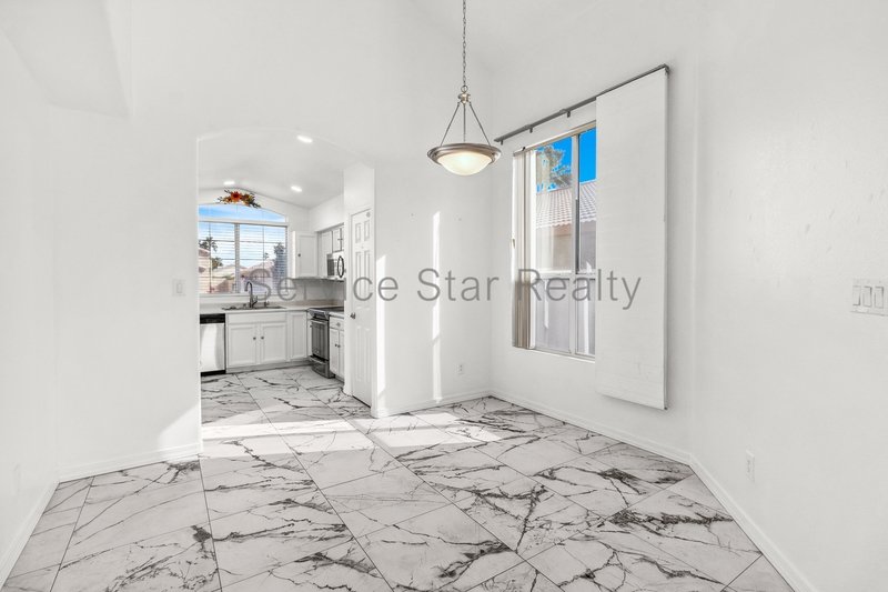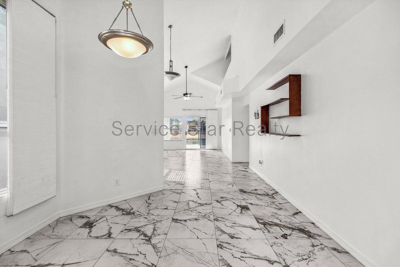 This home offers an inviting blend of elegance and comfort featuring marble-like tile throughout the first floor and tall vaulted ceilings in the living room. The living room seamlessly flows into the dining area, which sits just off the modern kitchen equipped with stainless steel appliances, light cabinetry, and a view window over the sink.
