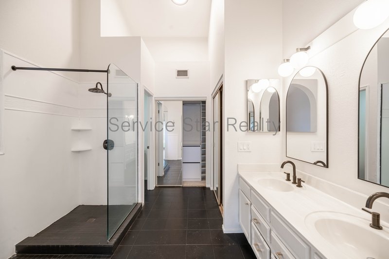 The kitchen offers a U-shaped design with a breakfast bar, perfect for casual dining or entertaining. The living areas are bright and airy, with plenty of natural light and vaulted ceilings enhancing the sense of space. The primary bedroom includes an en-suite bathroom with dual sinks, as well as a walk-in closet. Two additional bedrooms provide flexibility for guests, family, or a home office.