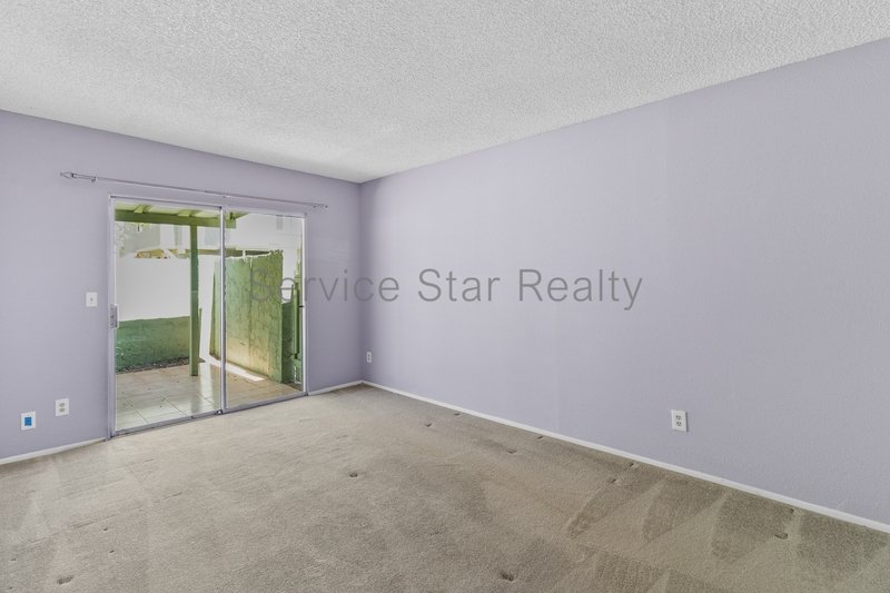 The bathroom features a timeless tiled shower/tub combo and a clean white vanity, while the hallway includes both a linen closet and a walk-in closet for additional storage. Both bedrooms are light-filled and carpeted, each with its own walk-in closet. The primary bedroom also offers private access to a second covered patio with its own gate to the complex.
