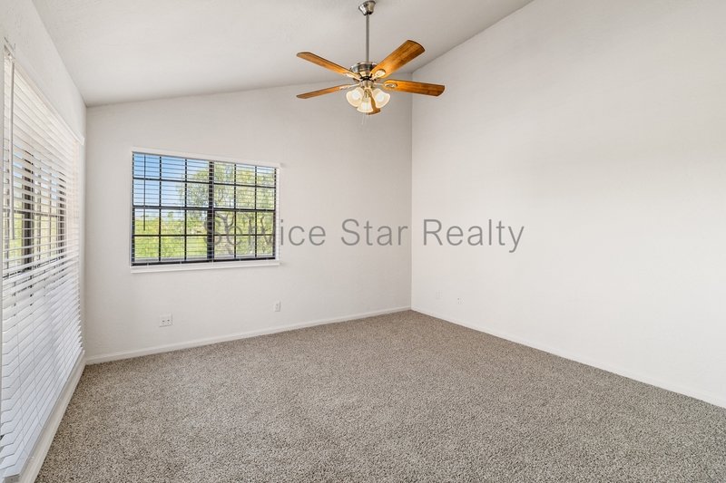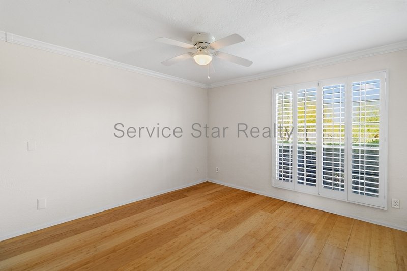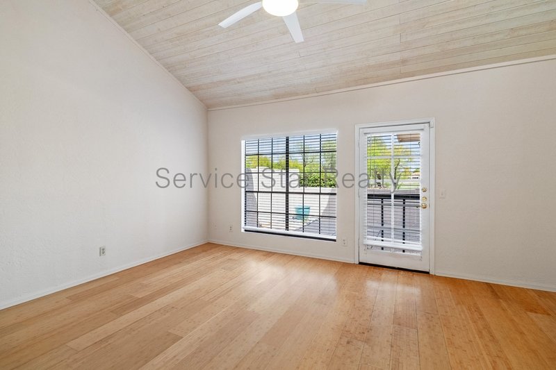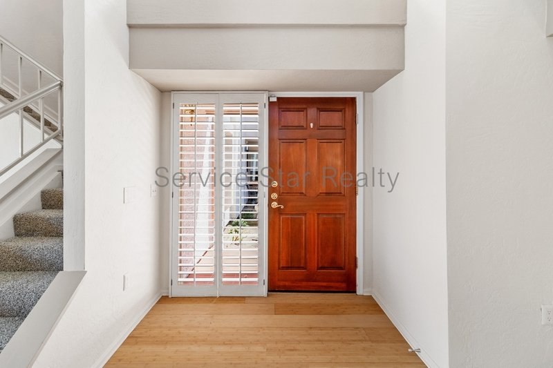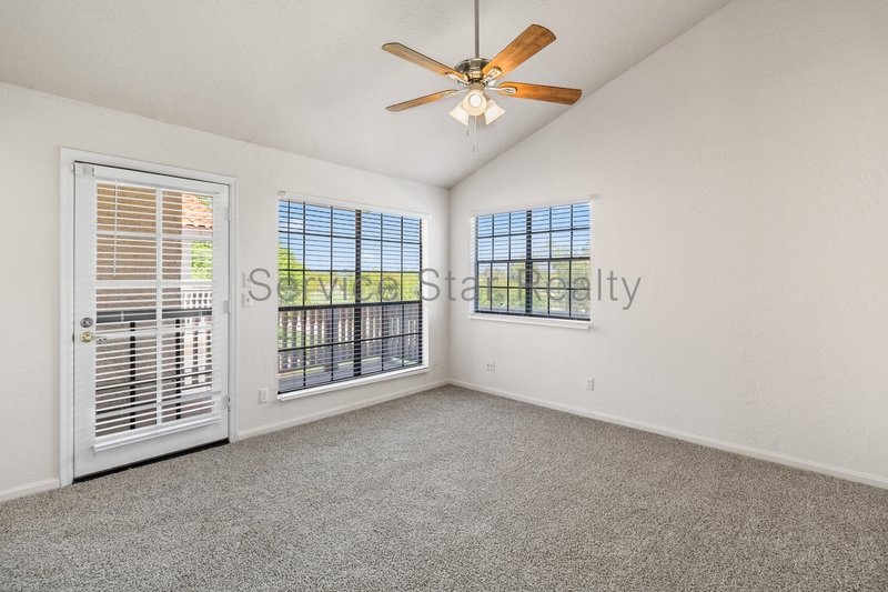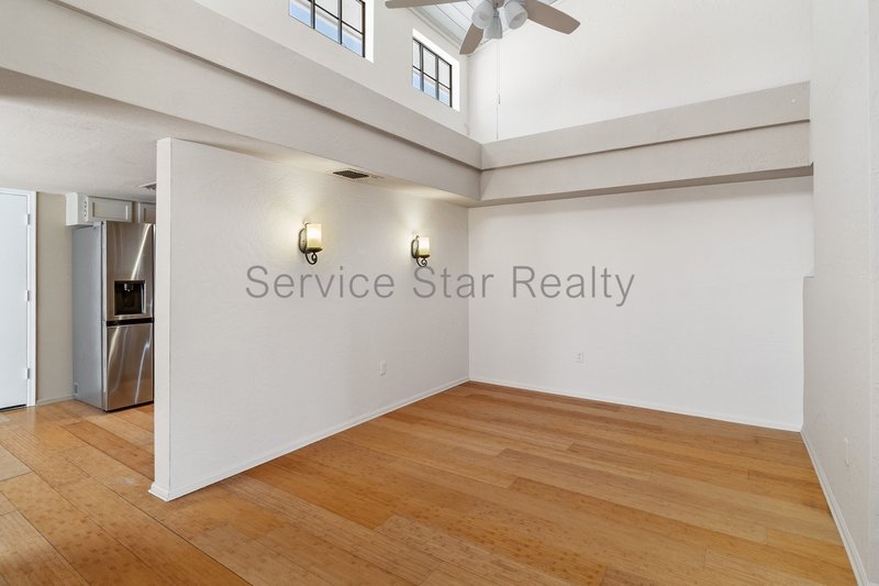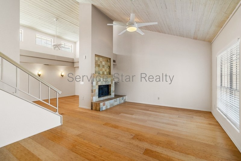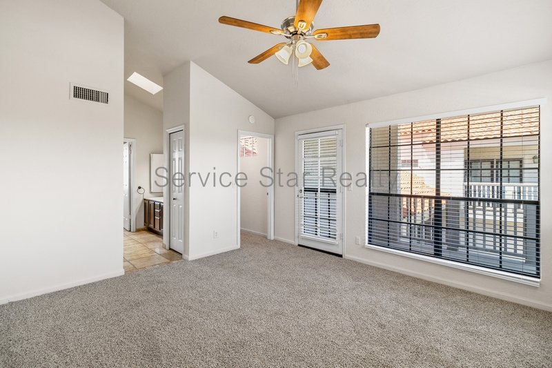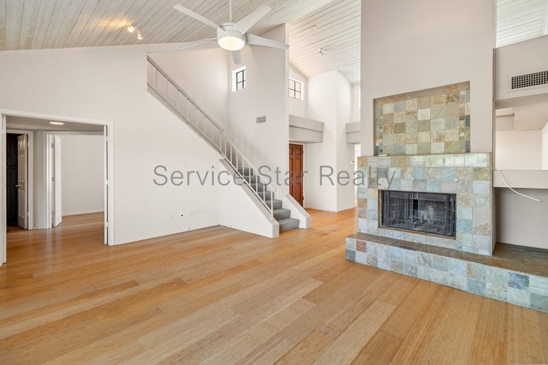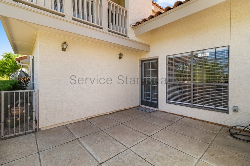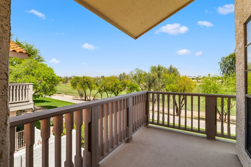 This 3-bedroom, 2-bathroom townhome is located in the Cabrillo Square community, offering direct views of the Silverado Golf Course and the McDowell Mountains. The home features high ceilings, a fireplace, and skylights, providing ample natural light. French doors lead to both the patio and the primary bedroom balcony, enhancing indoor-outdoor living.