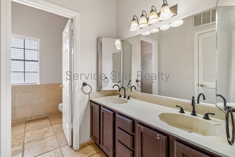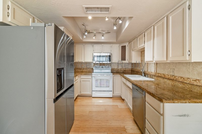 The kitchen includes granite countertops and a backsplash, while the bathrooms offer large vanities and custom tile work in the showers. The community features well-maintained landscaping, access to walking and biking paths, and proximity to the golf course.