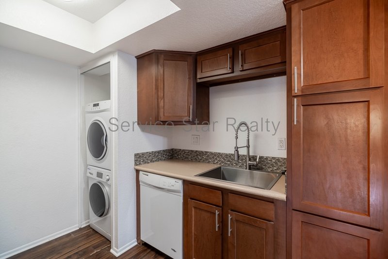 The kitchen is both functional and inviting, complete with matching appliances, a tiled backsplash, a stainless steel sink, and the bonus of an in-unit washer and dryer. Just off the kitchen, a cozy dining nook makes everyday meals or casual entertaining a breeze.