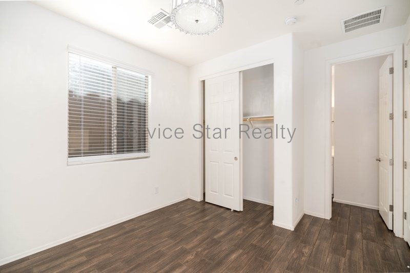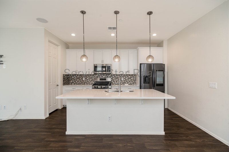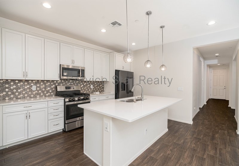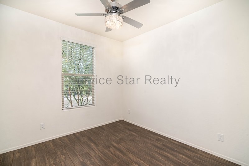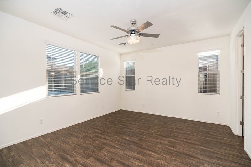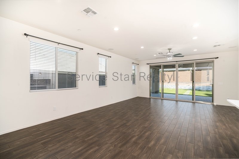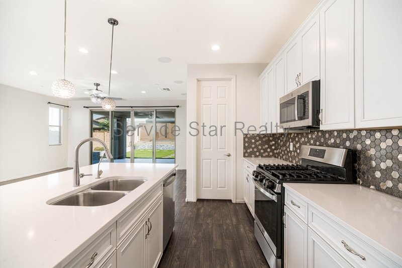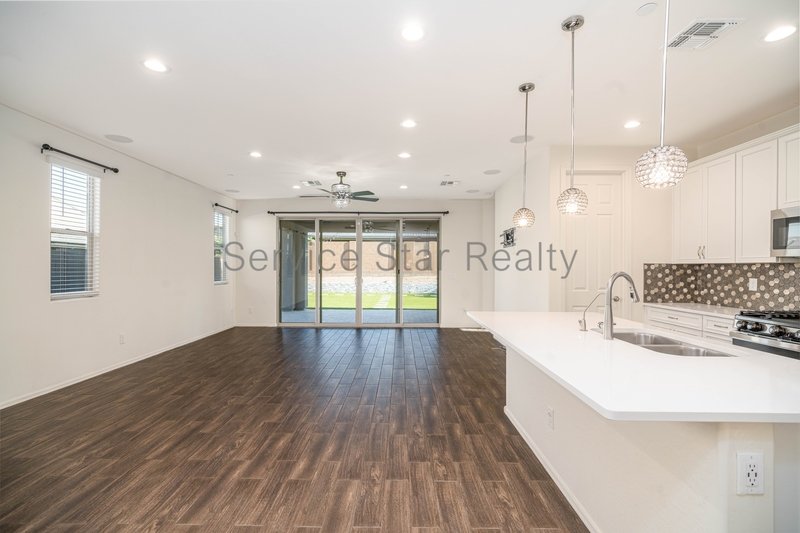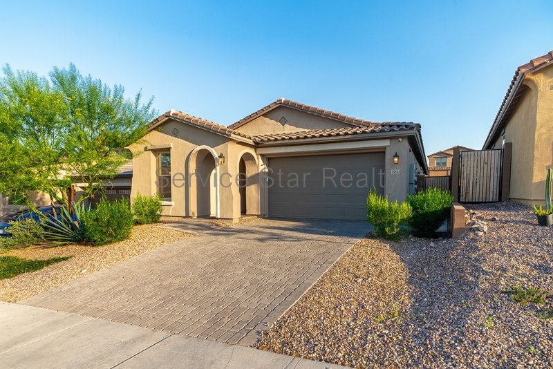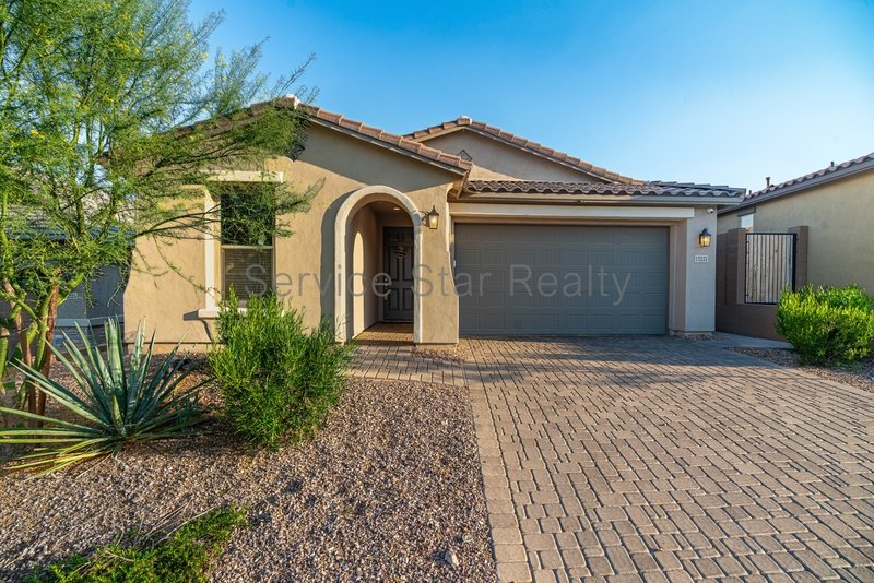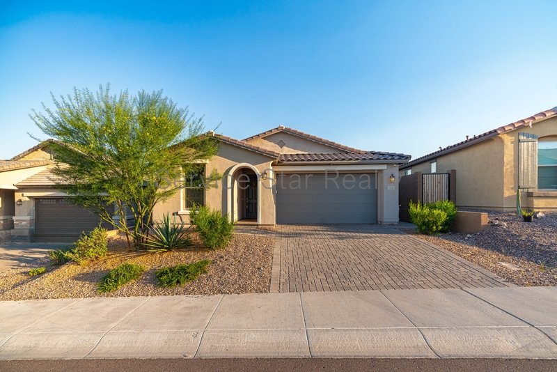 This exceptional open-concept, split-floor plan home combines comfort with modern conveniences and solar. Featuring three bedrooms and three bathrooms, it boasts dark wood grain tile flooring, bright white cabinetry, quartz countertops, and a stylish backsplash. The great room is enhanced by bi-parting double sliding doors that seamlessly connect the living space to a custom landscaped patio and yard, complete with artificial turf, cut stone benches, and planters. The home includes two guest rooms at the front and a cozy office adjacent to the great room. The master suite is located at the back, offering a spacious walk-in closet, a walk-in shower, and a private commode area. Additional amenities comprise a garage with complete epoxy flooring, a soft water system, and SOLAR system This beautiful home in Peoria Northern Vistancia Neighborhood is a must-see! You will absolutely love it!