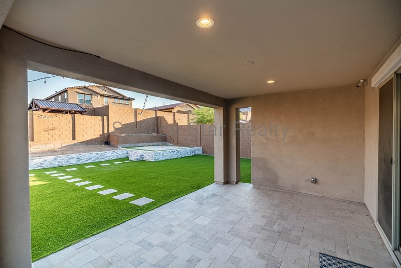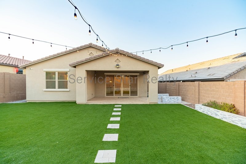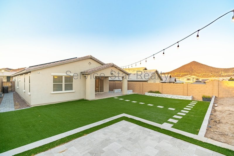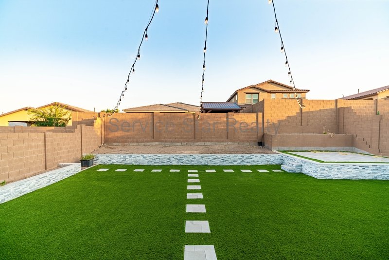 YARD: fully landscaped - front desert landscaping; Beautifully landscaped backyard! Full yard Artificial turf, cut stone benches and planters, with string lighting and pavers