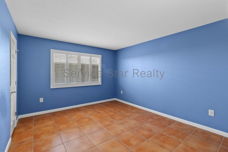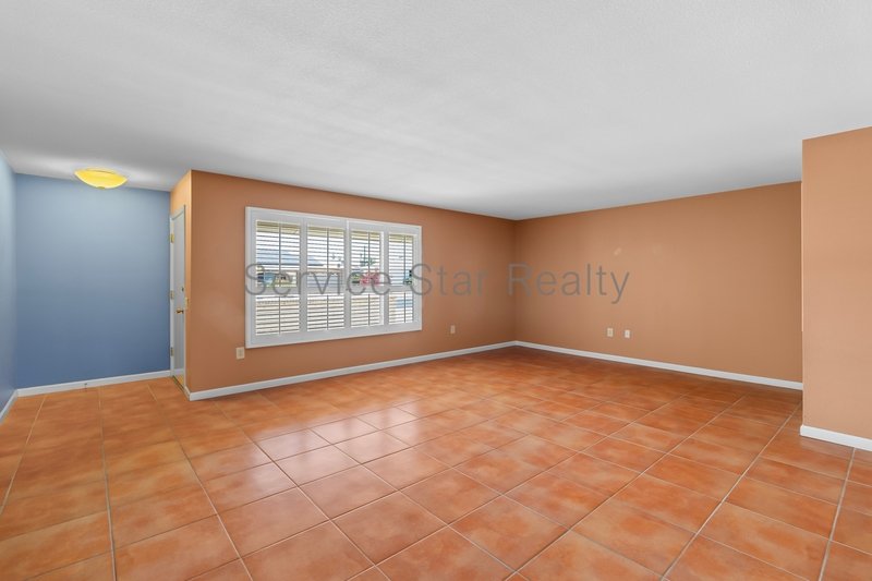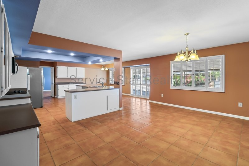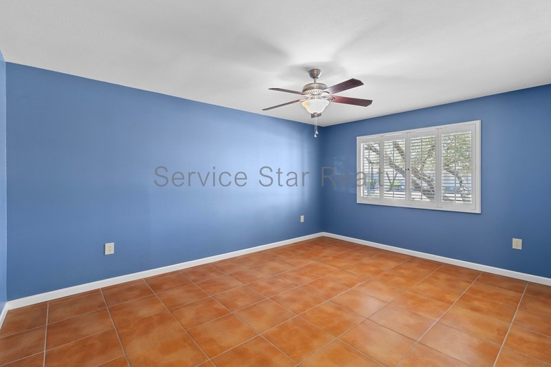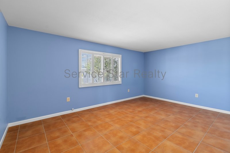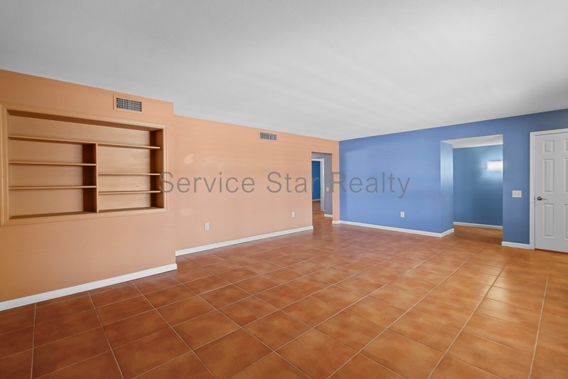 Step inside to find elegant tile flooring throughout and a bright, expansive living room featuring custom built-in shelving and plantation shutters on every window, offering privacy, timeless style, and abundant natural light.
