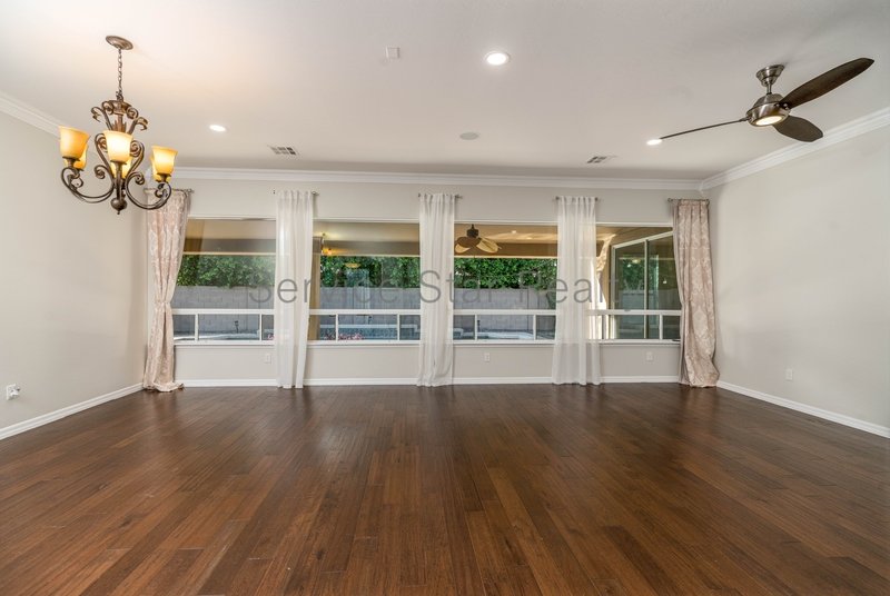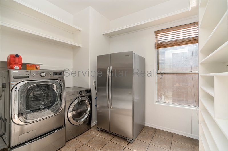 Toward the back of the home, a second living room offers a fireplace, backyard access, and sparkling pool views through oversized windows. The large laundry room adds extra convenience with extensive cabinetry, storage space, and even a second refrigerator.