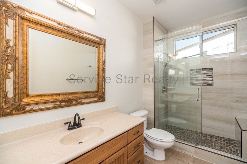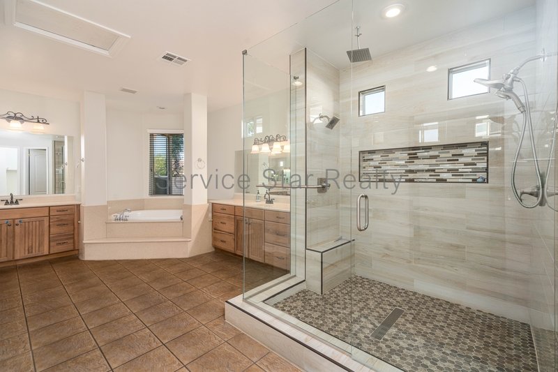 All five bedrooms are generously sized - four include walk-in closets and plush carpeting. The primary suite is a standout retreat with hardwood floors, private backyard access, a large walk-in closet, and a spa-like ensuite bathroom featuring dual vanities, a separate makeup counter, soaking tub, and a luxurious tiled walk-in shower with dual showerheads, including a rainfall feature.