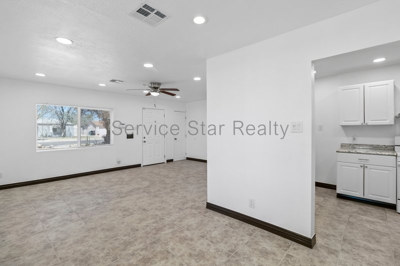 Step inside to a spacious, light-filled living room with a large picture window and ceiling fan for year-round comfort. The adjacent kitchen features stone countertops, a stainless steel sink, and crisp white appliances, along with a dedicated dining area that's ideal for both daily meals and entertaining.