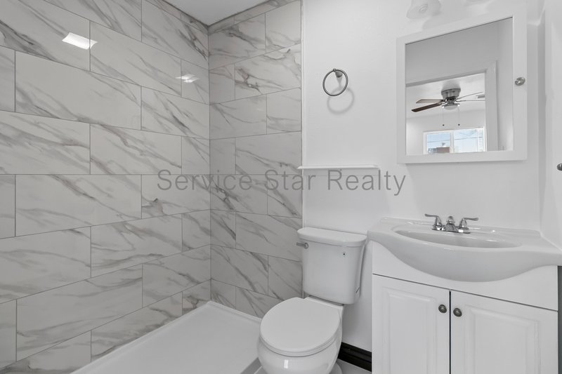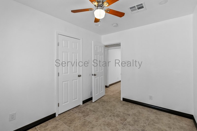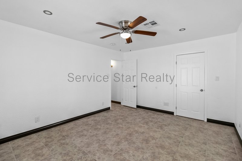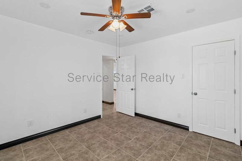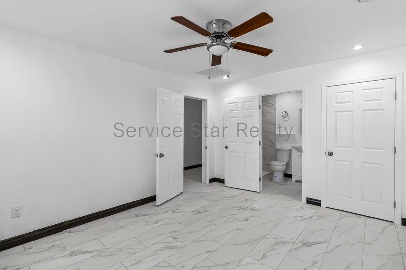 All four bedrooms are bright and inviting, each equipped with ceiling fans and tile flooring for a cool, cohesive feel. Three bedrooms share an updated hall bathroom with a sleek stone vanity, brushed stainless steel fixtures, and modern finishes. The private primary suite includes a walk-in closet and a beautifully updated ensuite bath with marble tile and a walk-in shower.