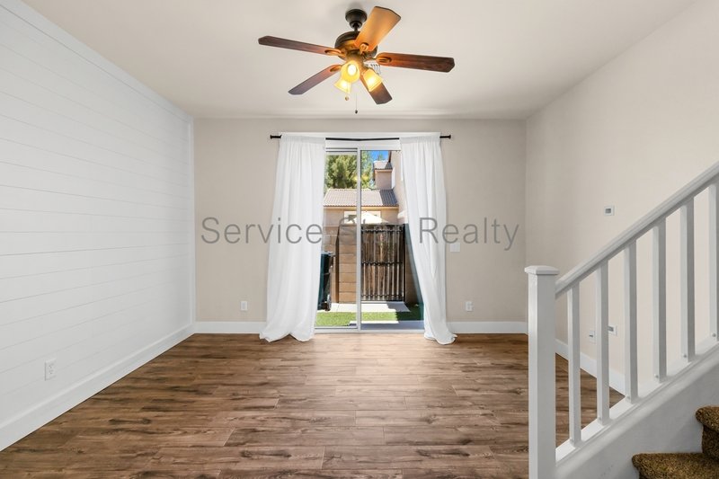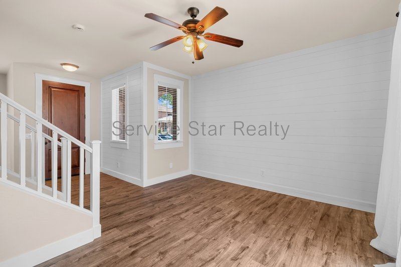 The spacious living room features a striking shiplap accent wall, wood-look tile flooring, a ceiling fan, and sliding doors that open to the back patio - the perfect setup for relaxing evenings or weekend get-togethers. Just off the living area, the dining room flows seamlessly into a well-appointed kitchen with crisp white cabinetry, contrasting black hardware, a center island, and generous storage space, making cooking and entertaining a breeze.