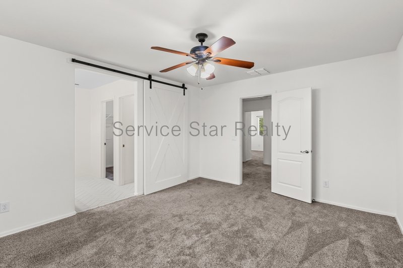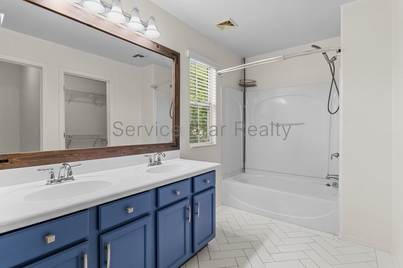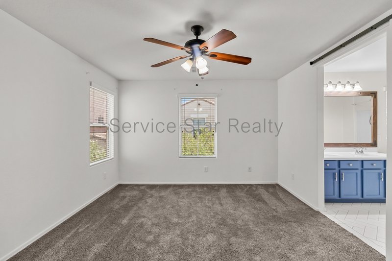Upstairs, you'll find all three bedrooms and a conveniently located laundry room. Each bedroom offers plush carpet, ceiling fans, and a bright, welcoming feel. The primary suite serves as a peaceful retreat with an ensuite bathroom showcasing elegant white herringbone tile, a shower/tub combo, a bold blue vanity, a water closet and a walk-in closet.
