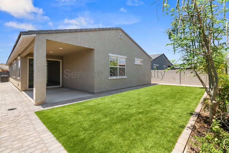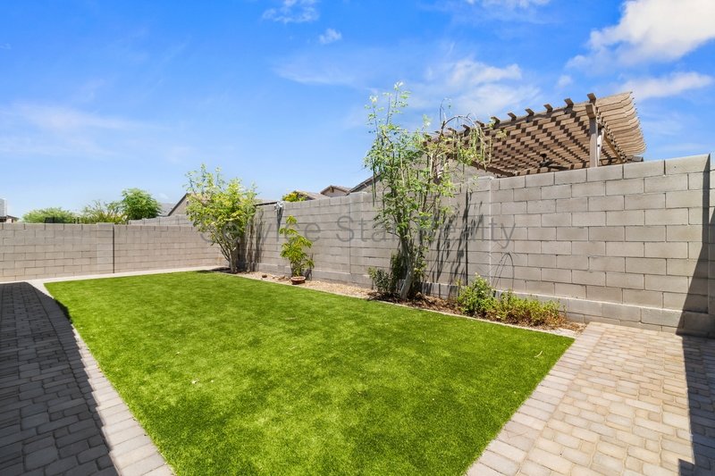 Step outside to your private backyard oasis with a covered patio, lush grass landscaping, and extended pavers, perfect for relaxing or hosting guests.