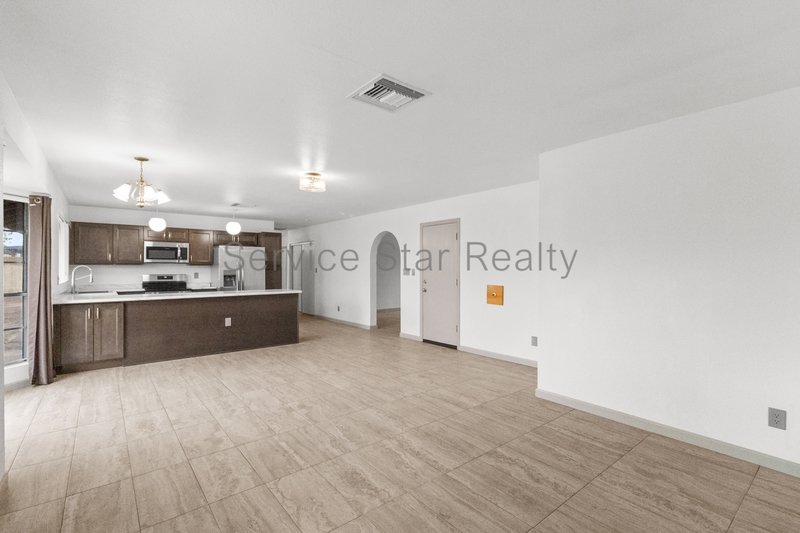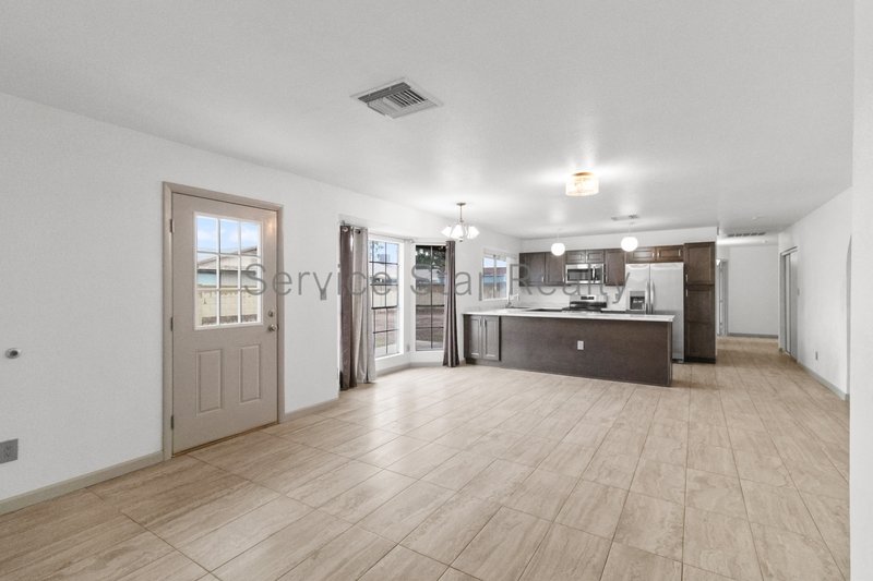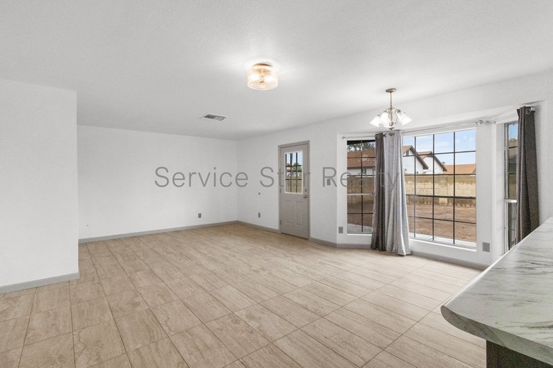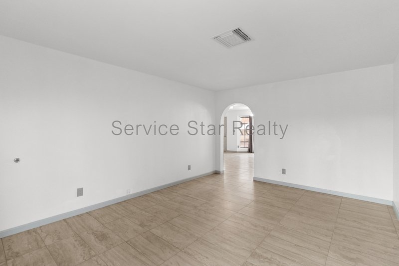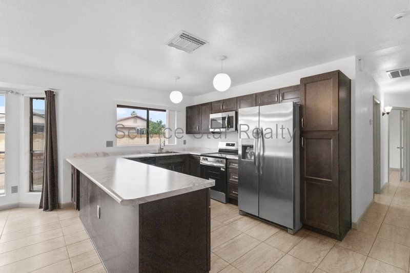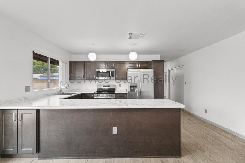 Welcome to this beautiful home featuring large tile floors and neutral paint throughout, creating an inviting space. The kitchen is a showstopper with rich wood cabinets, stone-like countertops, a peninsula with additional seating, and brand-new stainless steel appliances, including a dishwasher, oven/stove, microwave, and refrigerator. The adjacent dining area is filled with natural light from large windows overlooking the backyard and flows seamlessly into the spacious living room - perfect for family gatherings or entertaining.