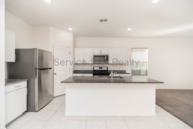 The kitchen is a true centerpiece, featuring a large center island with bar seating, sleek stone countertops, stainless steel appliances, and a spacious walk-in pantry. The open-concept layout flows seamlessly into the carpeted living roomperfect for relaxing or entertaining guests.