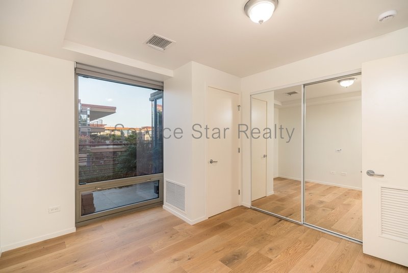 The kitchen features stainless steel appliances, stone countertops, and a peninsula with seating. The primary suite includes a walk-in closet and an ensuite bath with dual sinks and a tiled walk-in shower. The second bedroom also offers floor-to-ceiling windows and a built-in safe. Step outside to your private patio and enjoy the fresh air.
