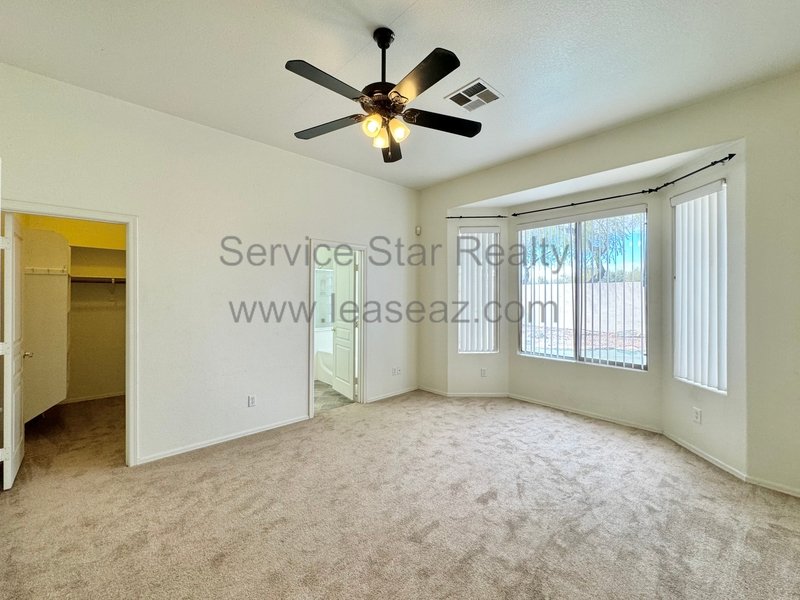 The master suite is expansive, with large windows overlooking the backyard, a walk-in closet, and dual-vanity bathroom with separate shower and tub.