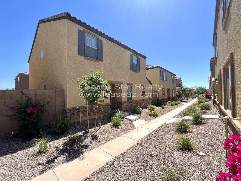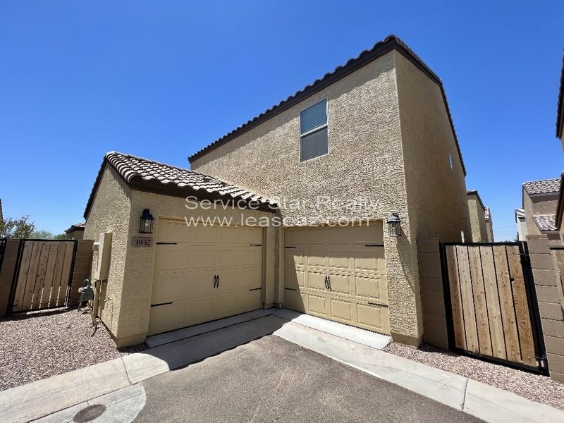 This home offers over 1900 square feet of space. First floor has tile throughout, kitchen has stainless steel appliances, chocolate cabinets, light bright granite counters and breakfast bar. Living room is also tile. Master bedroom downstairs with full bathroom with walk-in shower and walk-in closet. 1/2 bath downstairs and coat closet. Upstairs has carpet throughout where you will find 2 bedrooms at the front of the home and the 3rd bedroom on the opposite side near the large loft area and across from laundry room which offers full size washer and dryer. Hall bathroom has dual vanities and tub/shower combo and large linen closet off the hall. Low maintenance landscaping in both front and back yard. There are 2 single car garages attached to this home for ease of parking. This home is across the street from the greenbelt, sand volleyball court and playground and additional open parking.