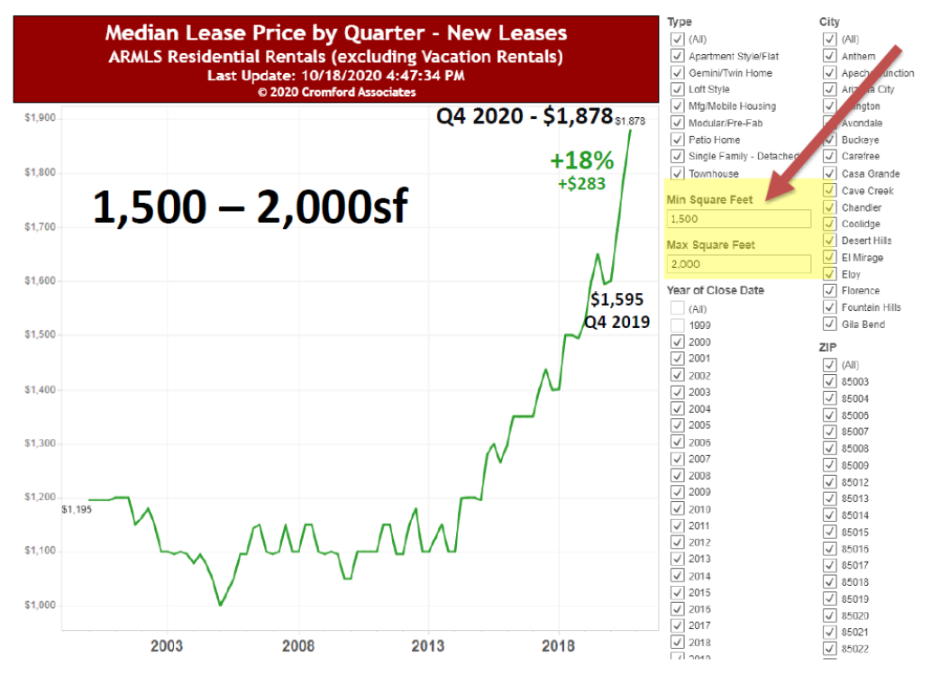As a Phoenix property management company, we have watched as rental prices increased for many of our property owners. Since the last quarter of 2019, the rental price of a 1,500-square-foot to 2,000-square-foot unit has increased by 18 percent. The price has increased by $283 from $1,595 to $1,878.